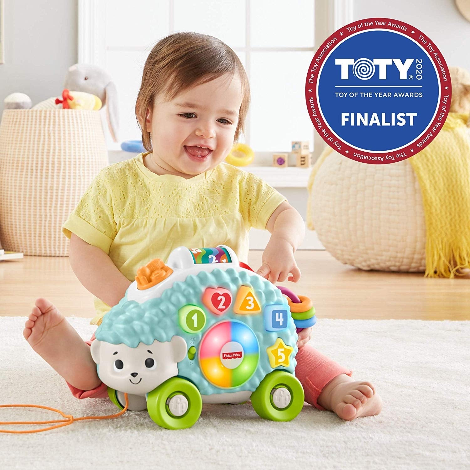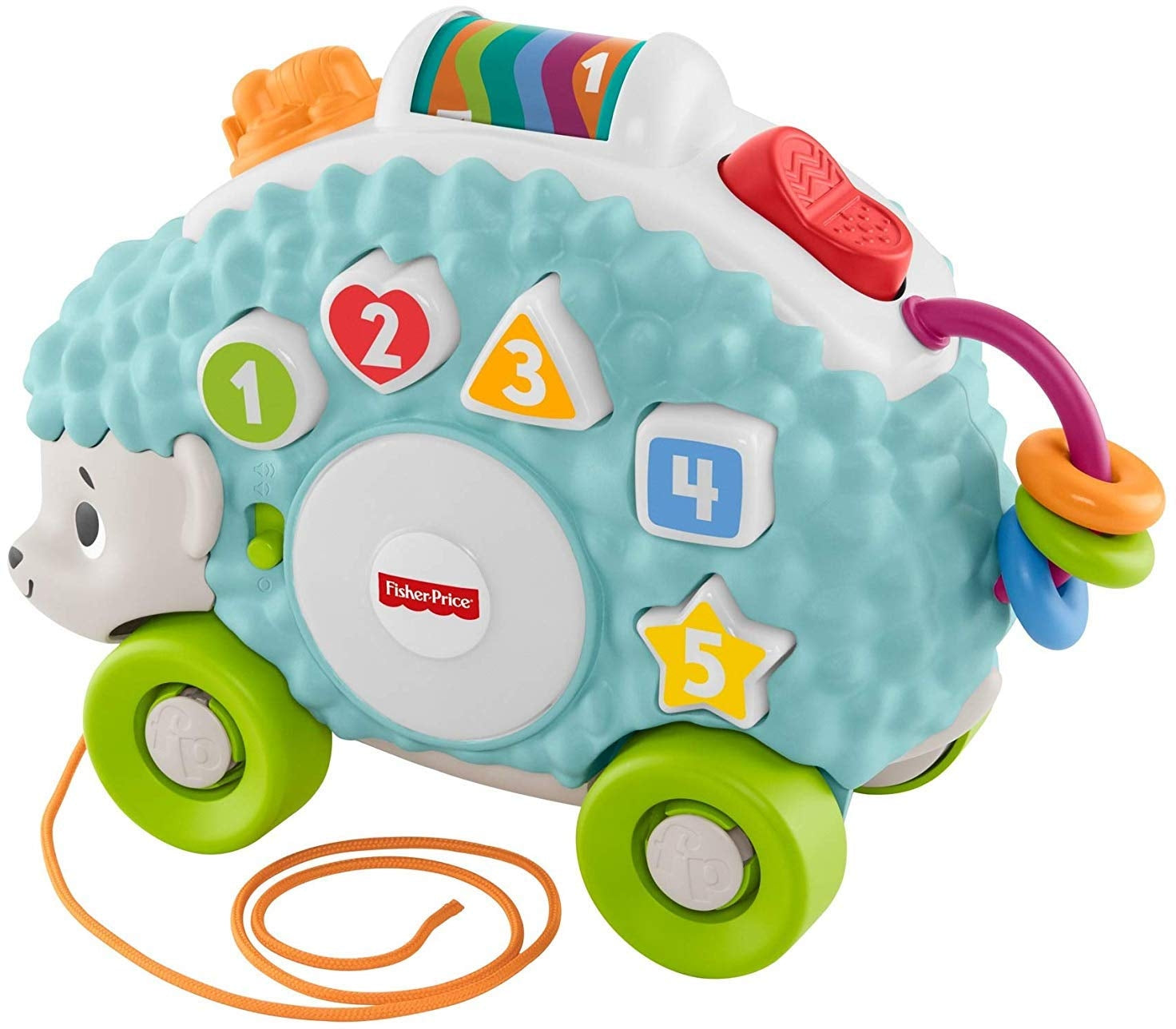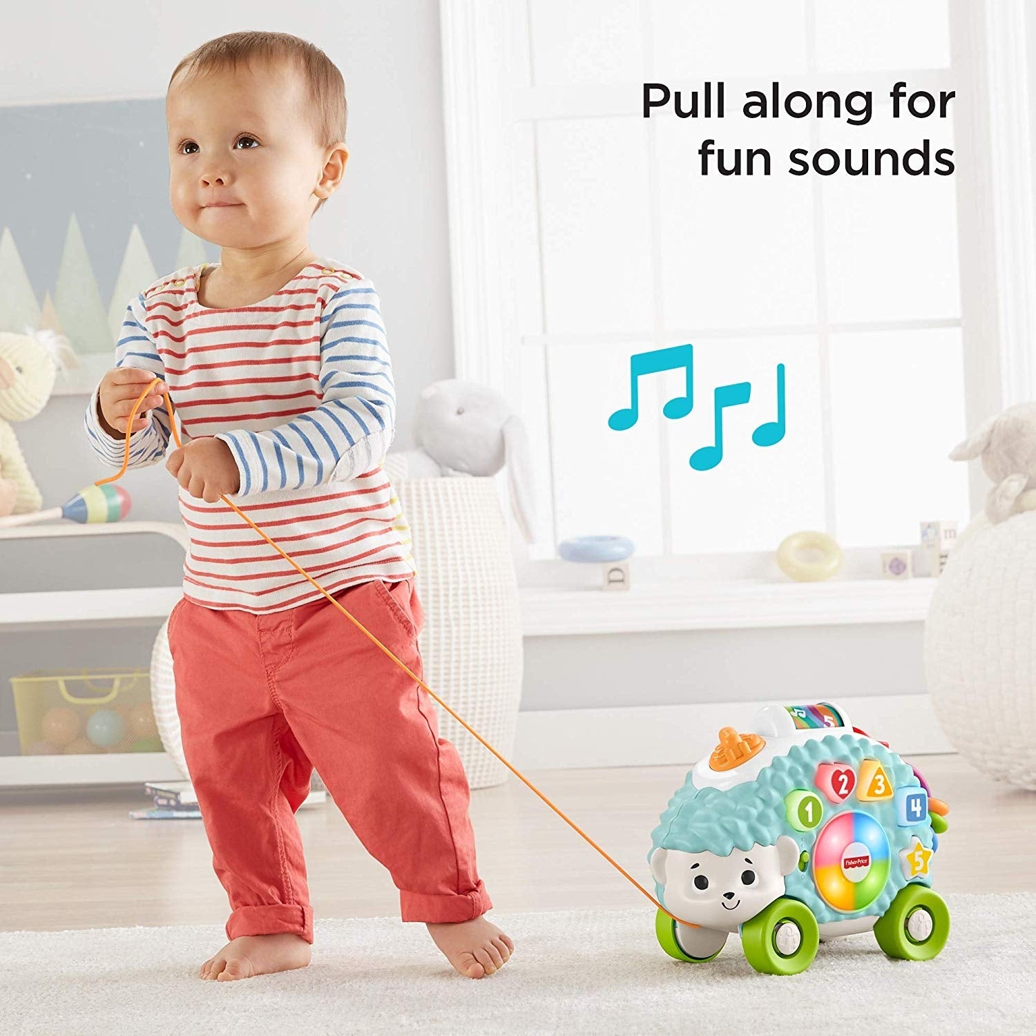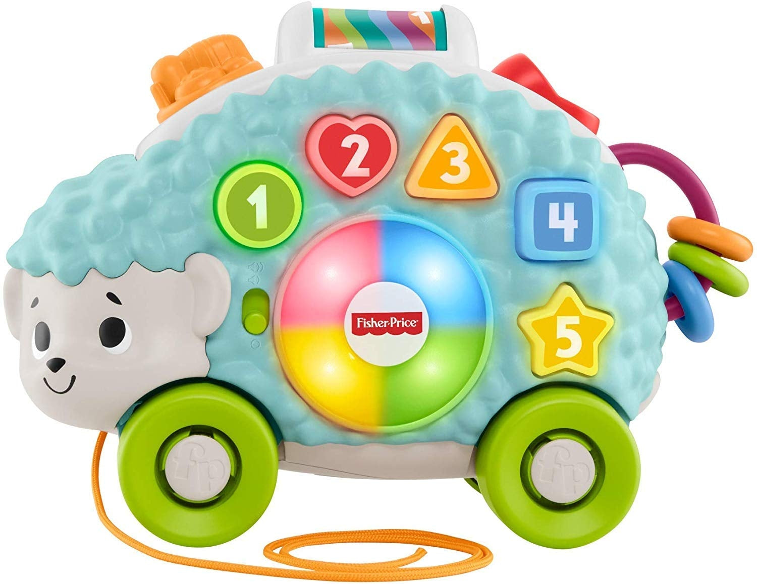 Fisher-Price Happy Shapes Hedgehog is a toy that can be with pushed or pulled along for fun music and sounds, with light-up buttons to learn about colors, shapes and numbers. Younger babies can spin, turn, toggle, and bat the activities on their buddy's back, or press the light-up buttons. Then older babies can push or pull the hedgehog along. Packed with exciting play that grows along with your baby!