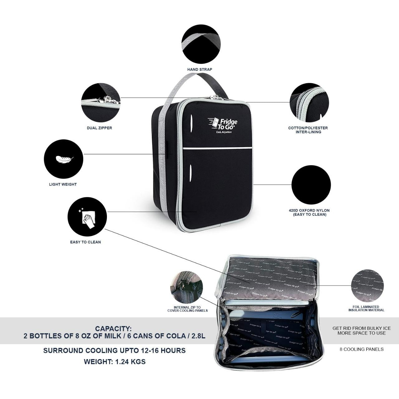 Fridge-To-Go Mini Fridge 6 Cooler Bag is a portable fridge cooler bag that requires no battery or ice to function. It bridges the gap between traditional cooler bags and battery/power-operated travel refrigerators. With her special chilling technology that could chill for up to 8 hours, Fridge-To-Go satisfies a wide range of applications in both the consumer and commercial market. Fridge-To-Go is ideal for the transportation of medications (including insulin or vial), wine, expressed milk for breastfeeding moms, and even ice creams in our high performance models.