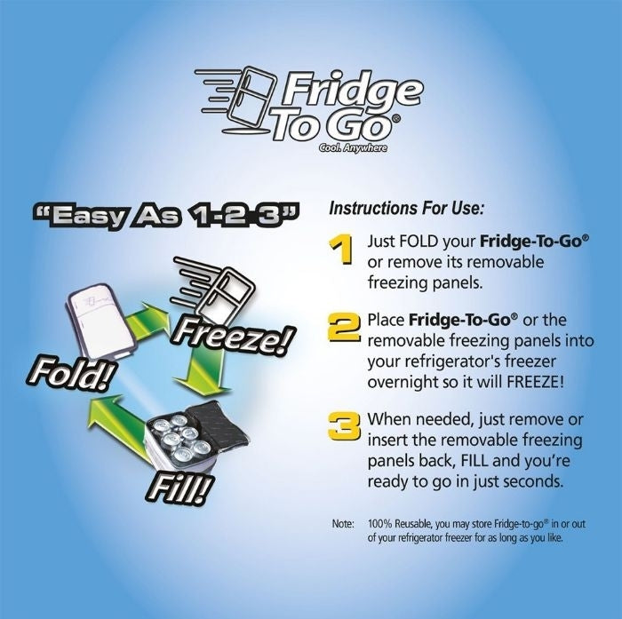 Just simply FOLD your Fridge-To-Go® and place it in your FREEZER overnight. When you need it, just simply FILL it and go. No Messy Ice, No Bulky Ice Packs!