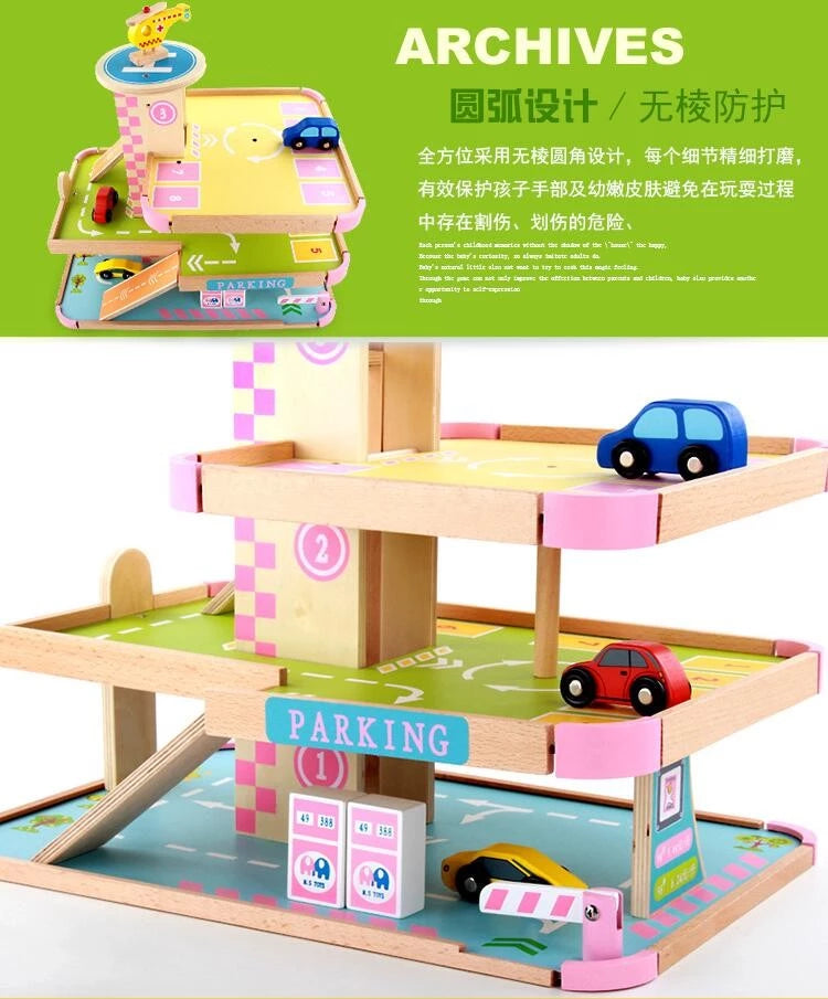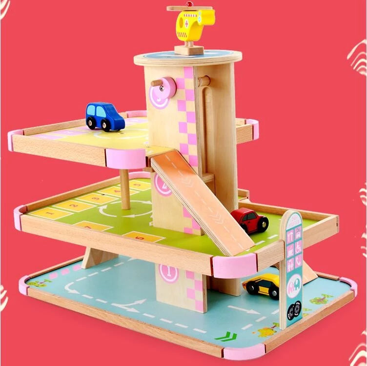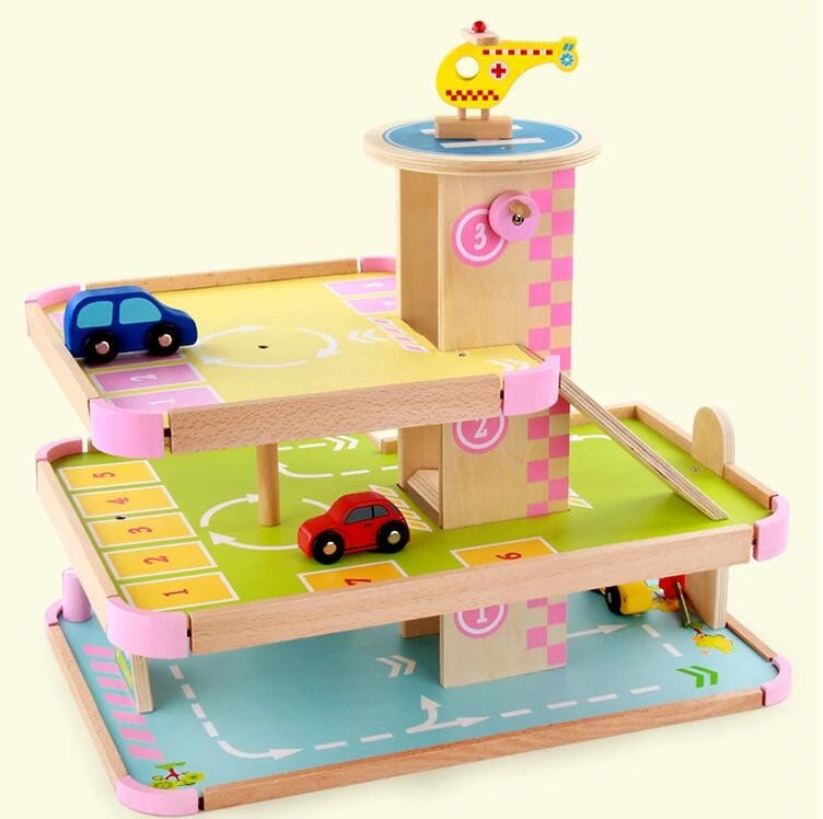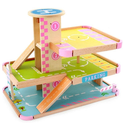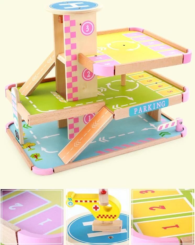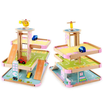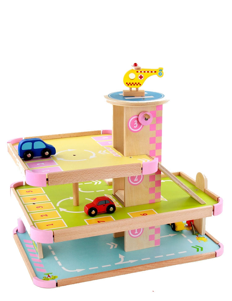 - Cheerful coloured wooden garage featuring 3 storeys, ramps, toy cars and a helipad with helicopter