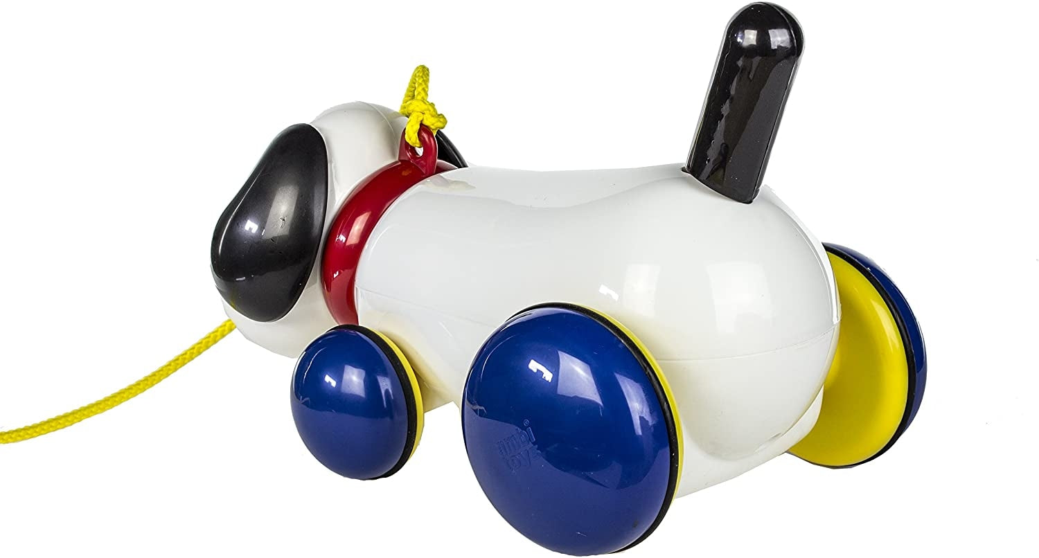 - Pull-along white dog with black ears, tail, nose, and eyes