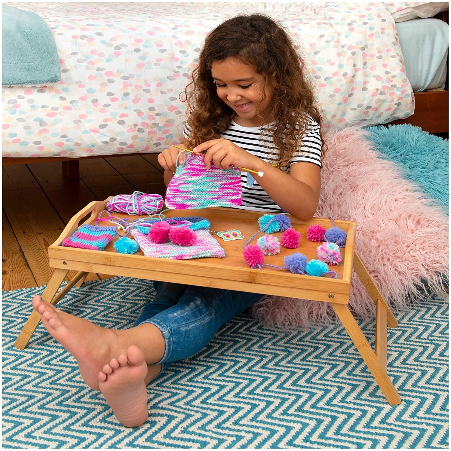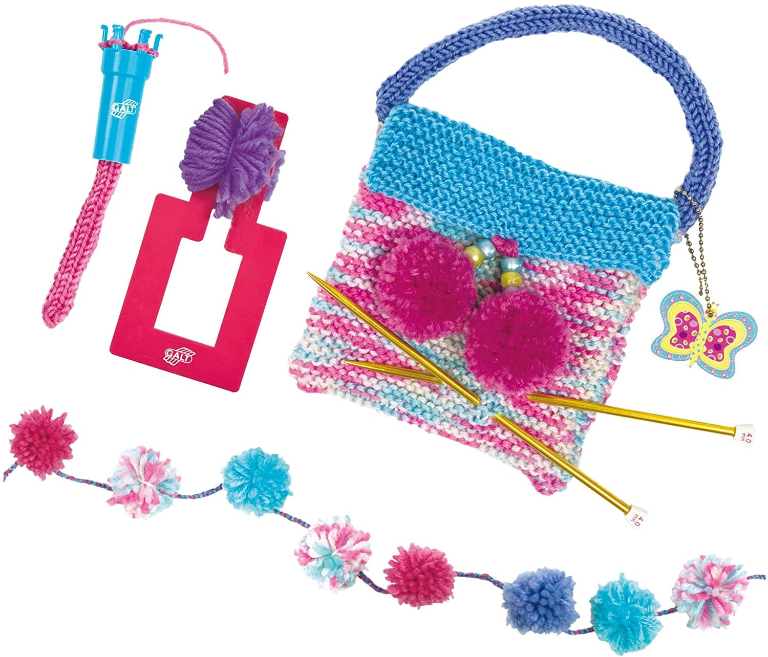 Galt Toys First Knitting is a knitting kit that comes with everything you need to create a knitted bag, cute purse and fun pompom scarf using the French knitter, knitting needles and pompom tool. Learn how to knit using the detailed step by step guide. What's more, it also comes with 2 cool bag charms to hang from your knitted bag and purse.Β Learn to knit with the two techniques included in the Galt First Knitting set.Β Theyβre the ideal birthday party gift or rainy-day activity for children.