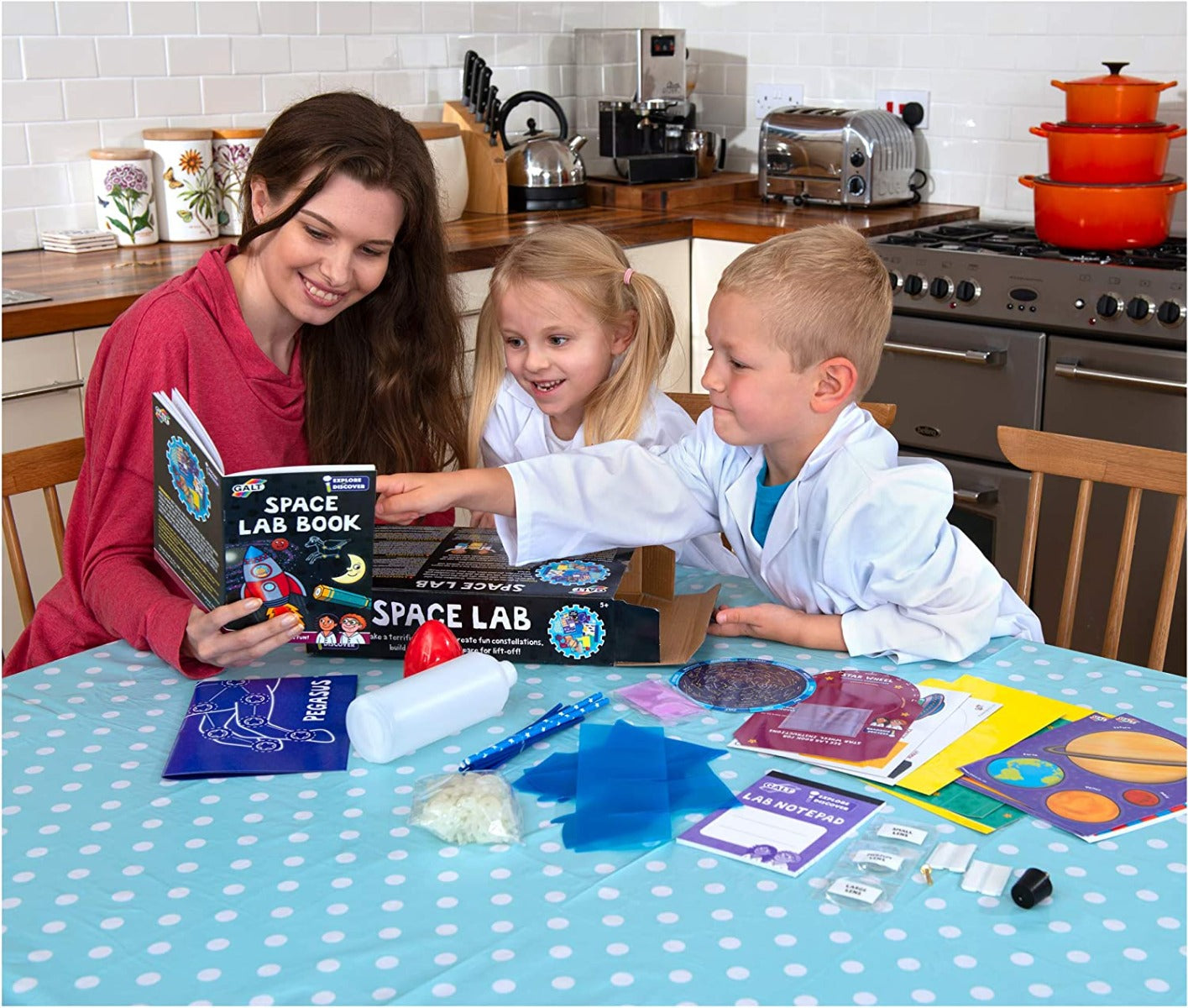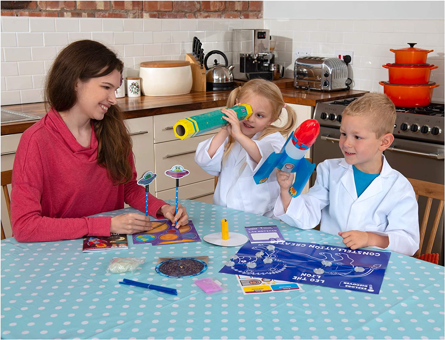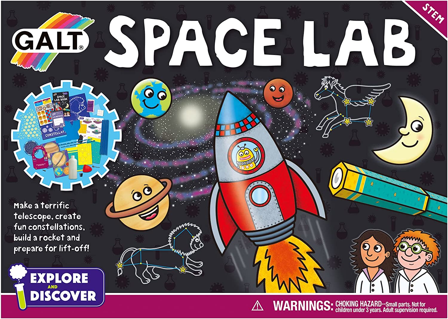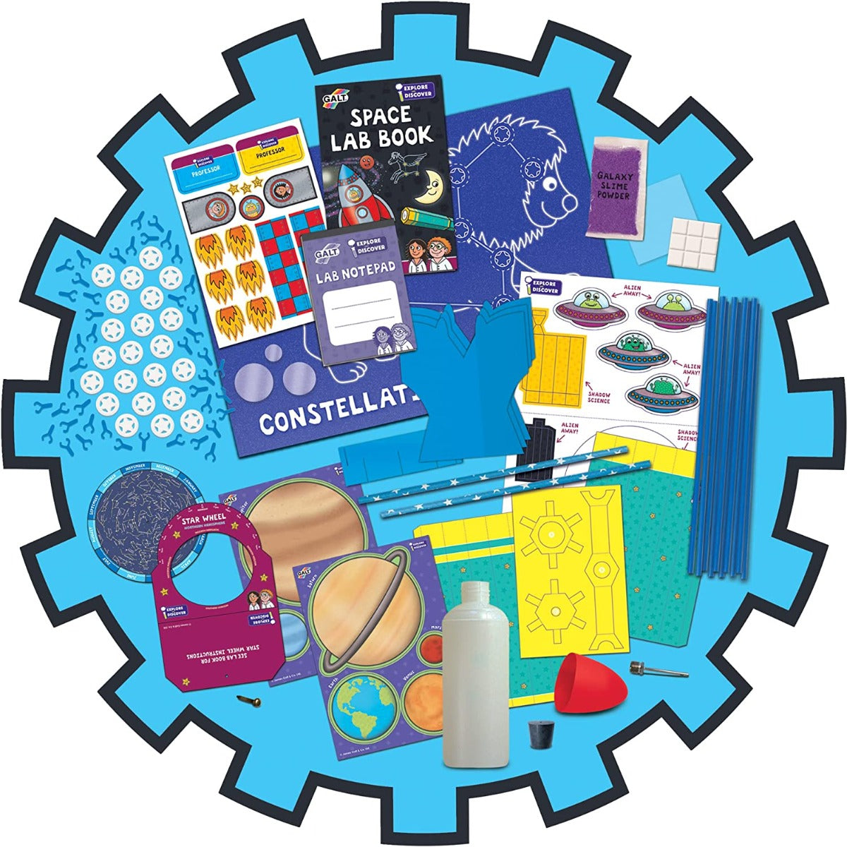 Contents: 22 glow stars with 46 glow connectors, 10 constellation straws, rocket bottle and fins, nose cone, rubber stopper, valve, galaxy slime powder, 3 telescope lenses, 2 paper straws, white tack, split pin, plastic sheet, A3 constellation guide, printed card pieces, glow planet stickers, sticker sheet, notepad and 24-page Lab book.