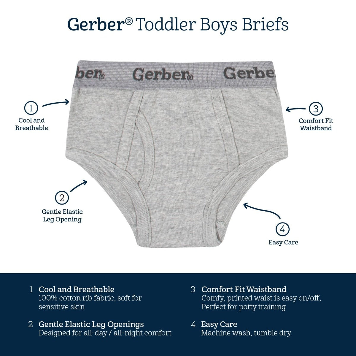Gerber Toddler Boys Briefs is a pack of 7 boys' underwear that are a practical addition to any young boy’s wardrobe. Each pair is made with cotton rib, a super soft and breathable fabric that’s perfect for sensitive skin. The cotton rib is the perfect fabric to wear underneath any and all clothing and toddler-boy outfits to prevent irritations and promote cleanliness. These toddler boys’ underwear feature comfortable, elastic waistbands printed with our logo. The waistbands are easy to pull up and down so using the potty and getting dressed is simple and struggle-free for your little one. This pack includes seven pairs of toddler boys’ boxer briefs, one for each day of the week.