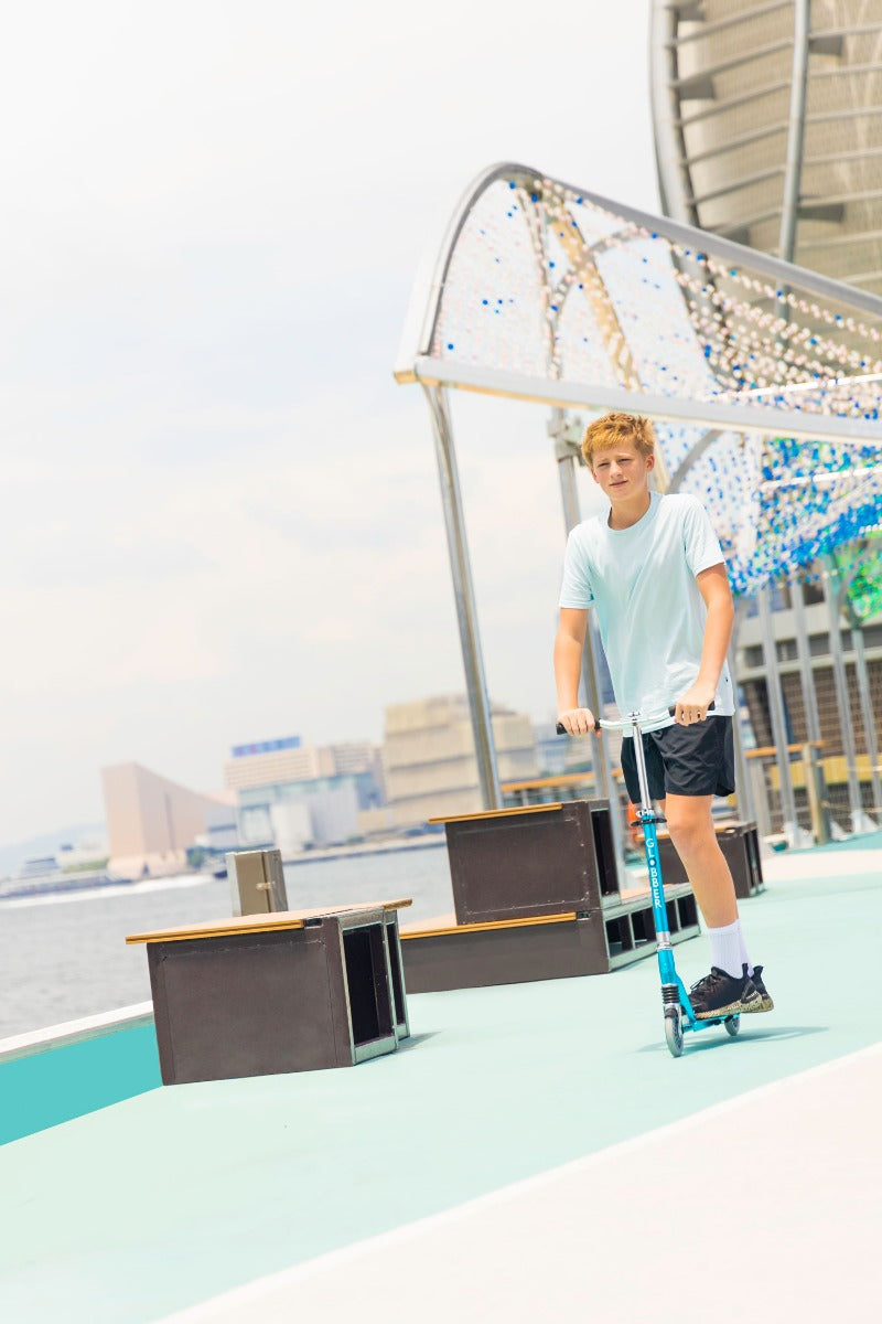 Adjust your 2-wheeler scooter to the most comfortable position with a 4-height adjustable, wide, and curved aluminium T-bar—the FLOW ELEMENT COMFORT grows with you! The handlebars are also foldable and come with comfortable and durable TPR ergonomic grips and an anti-shaking clamp for the smoothest rides.