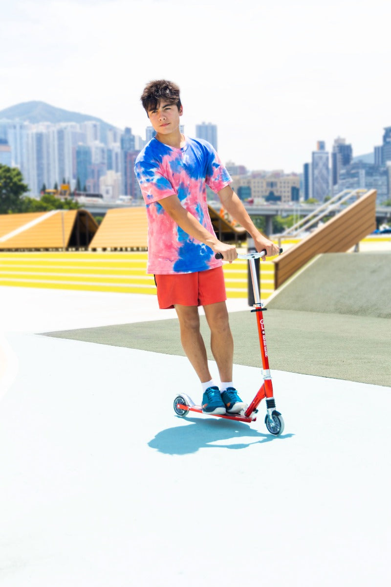 - 2-wheeler scooter for kids and teens aged 5+ with an easy, fast, and secure patented folding system: Simply lift the button upward to put the scooter into self-standing or folded mode.