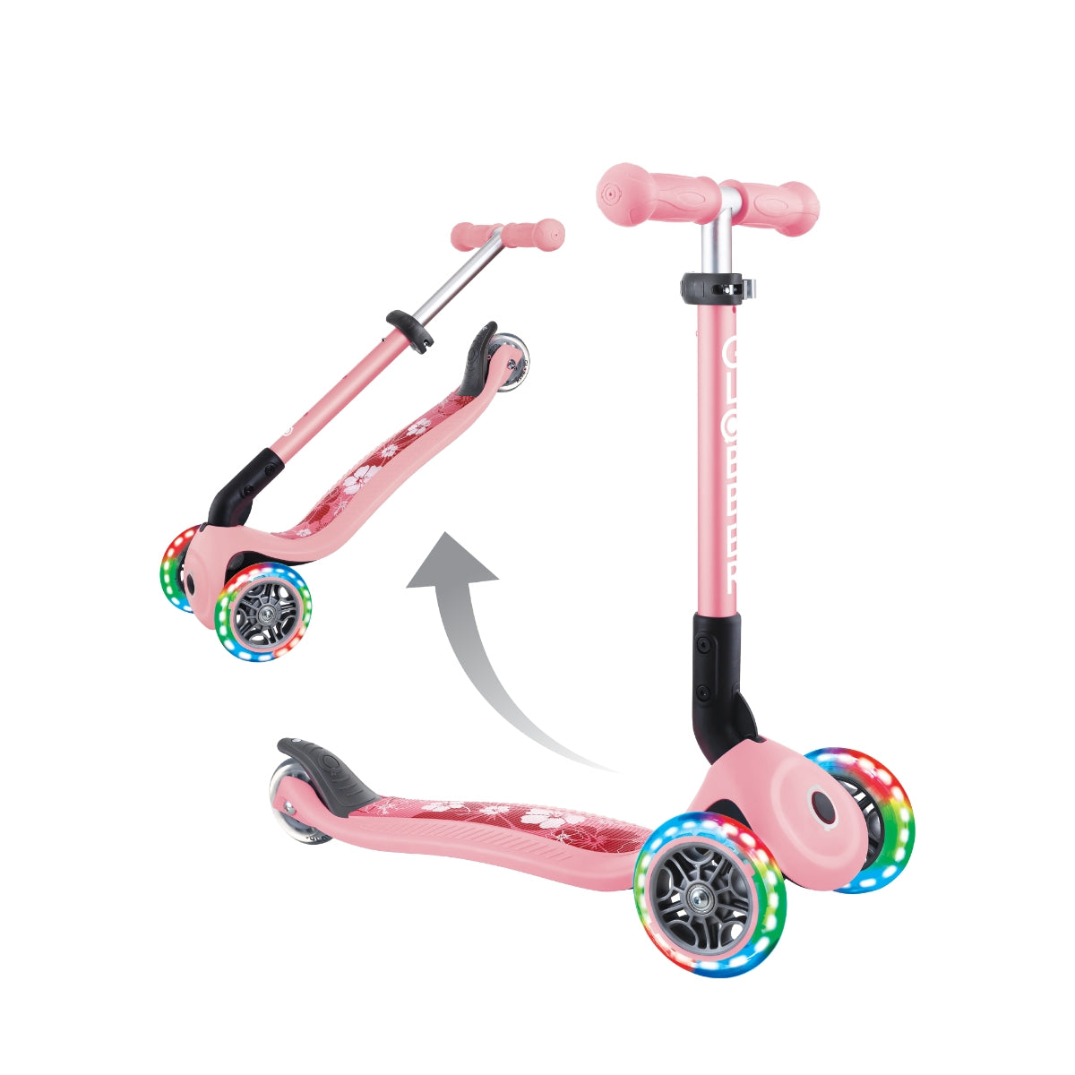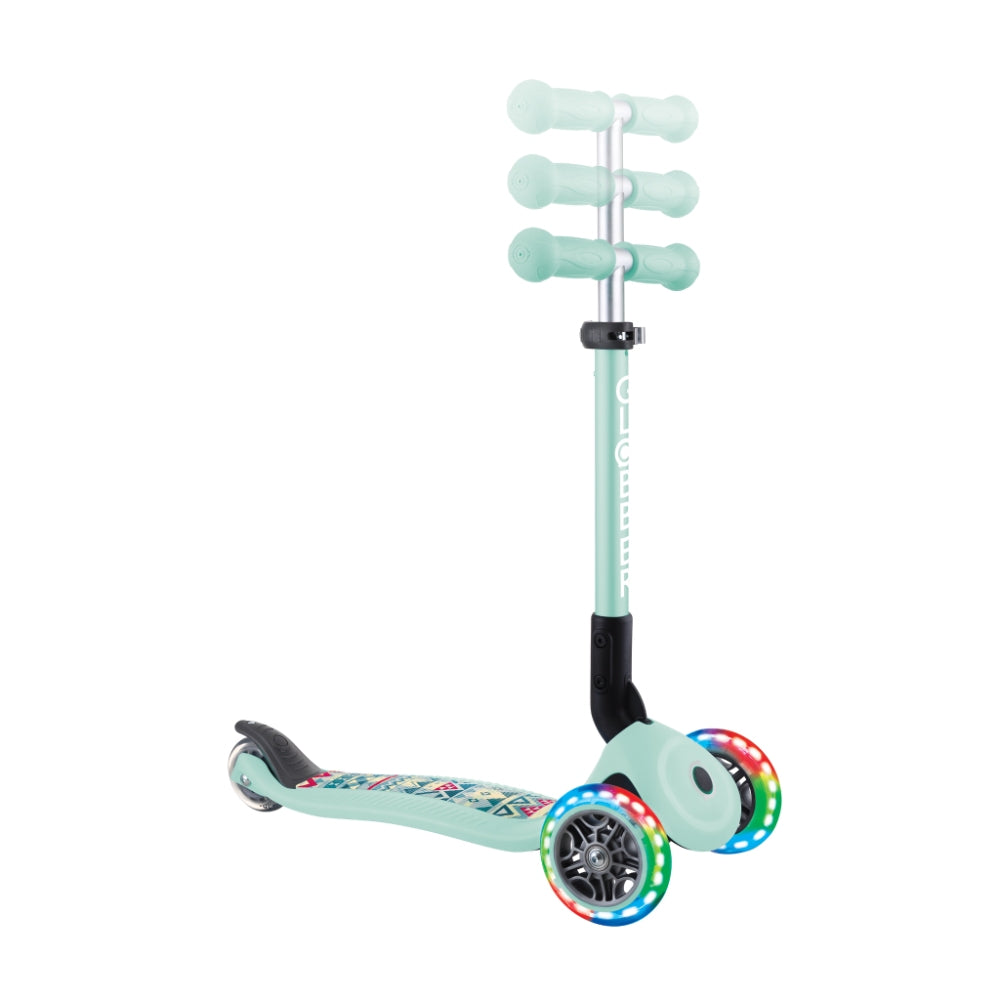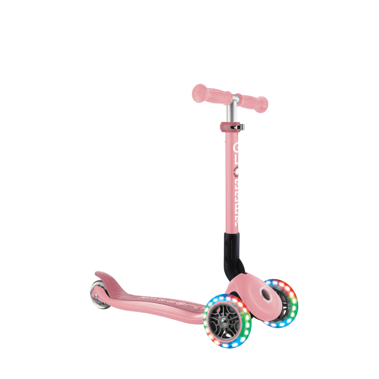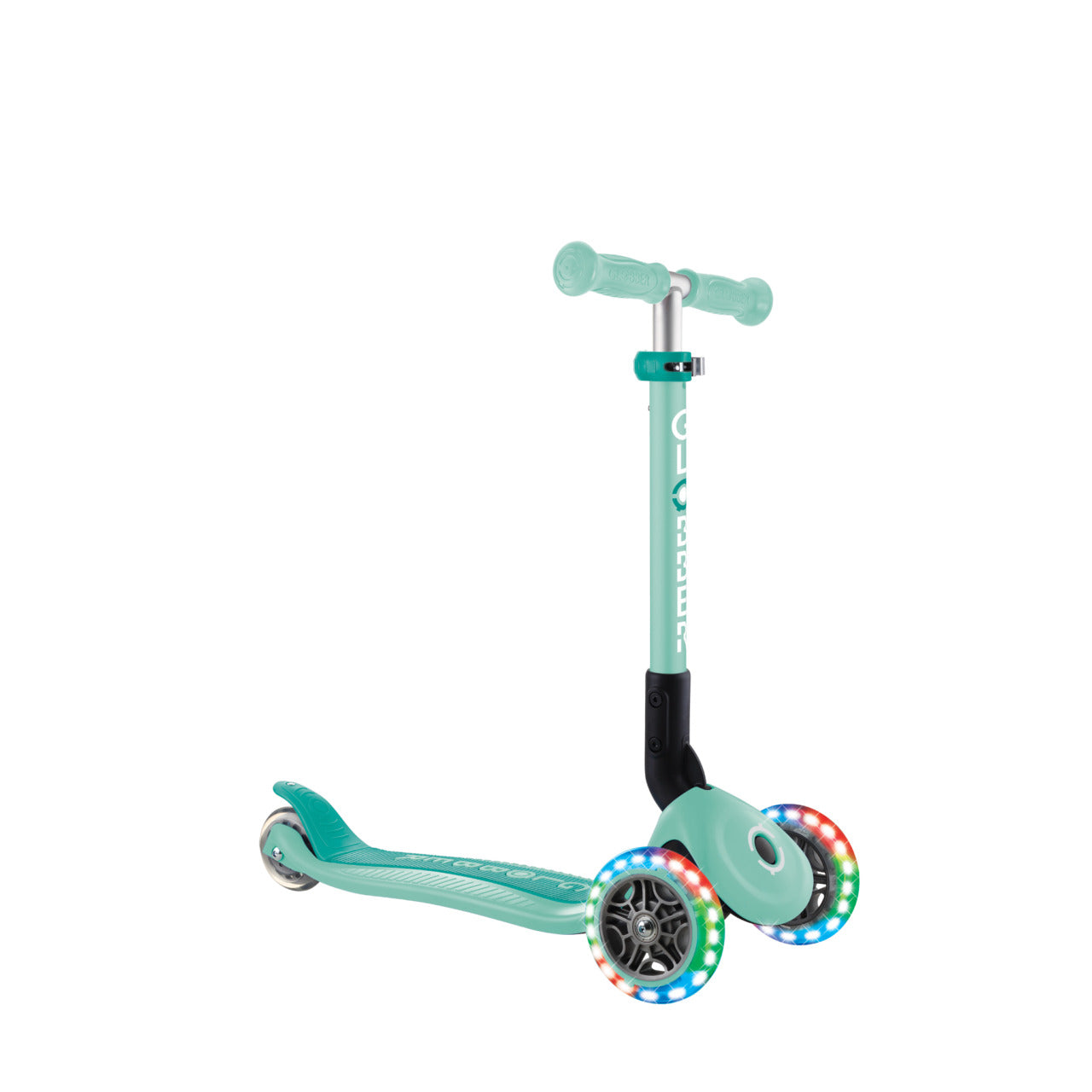 Equipped with a patented folding system, easily carry and compactly store your JUNIOR FOLDABLE LIGHTS! Plus, effortlessly fold this 3-wheel scooter into trolley mode for you or your toddler to roll home after a fun scooting day.