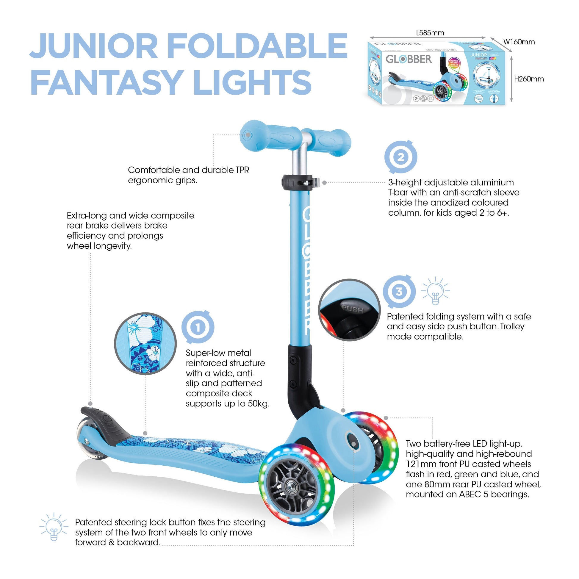 Globber Junior Foldable Fantasy Lights Scooter is a scooter intended for children aged 2 years and up, offering a themed painted deck and light-up wheels, bring a sense of fun into their first gliding experiences. A foldable scooter for toddlers and kids with a 3-height adjustable T-bar, allowing maximum product usage as your child grows! It also comes with a patented steering lock system, allowing your toddler to learn how to balance. Designed for safe learning, its three-wheel configuration, sturdy low deck and user stability/comfort make this a great first scooting experience.
