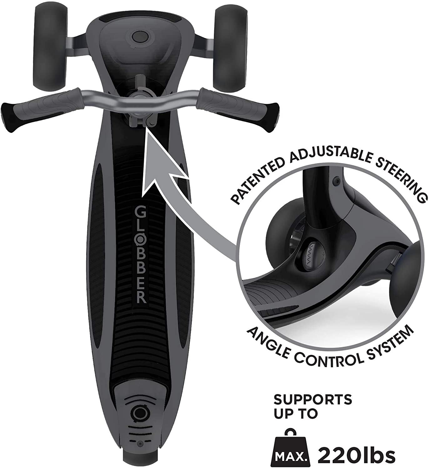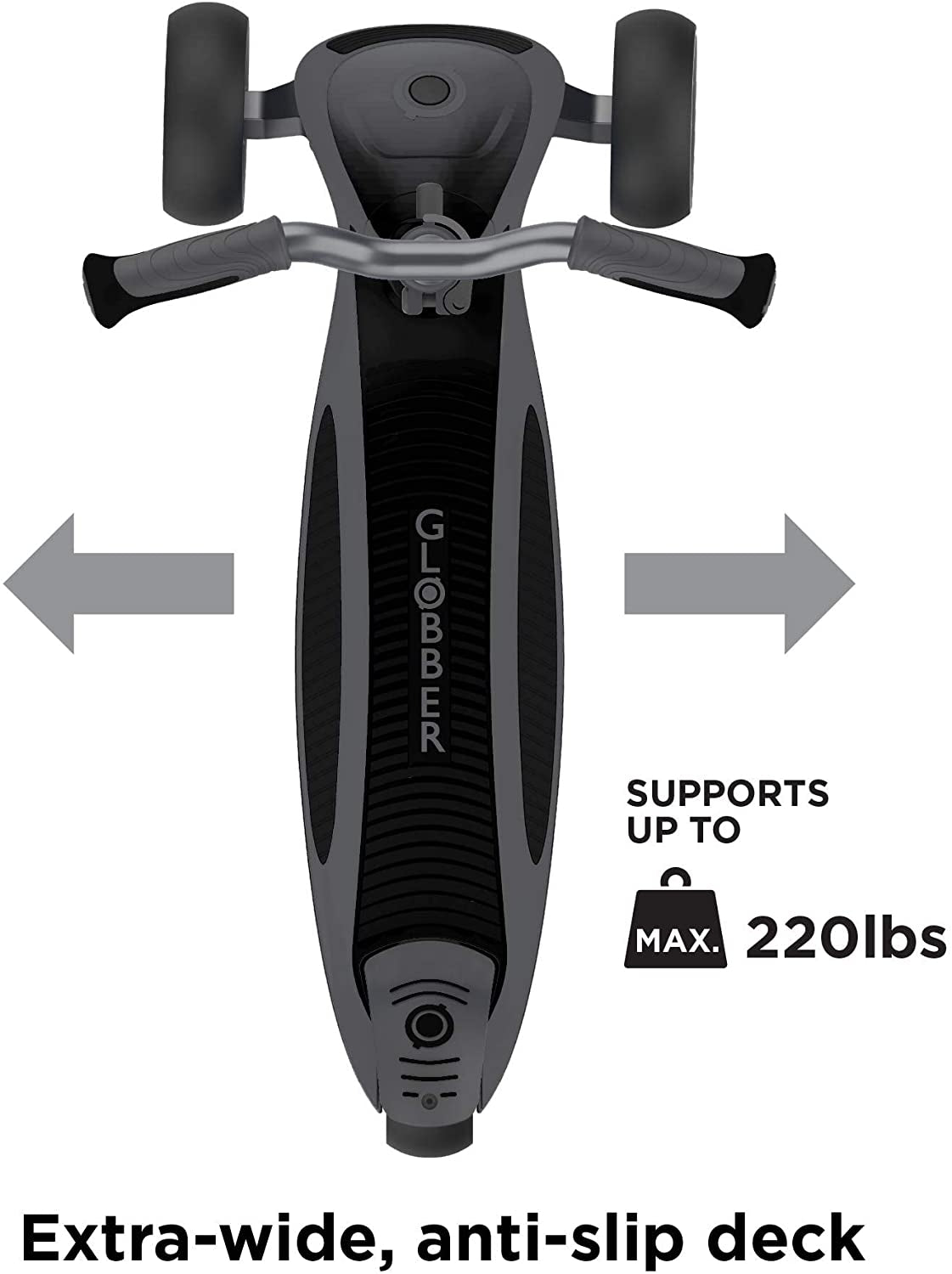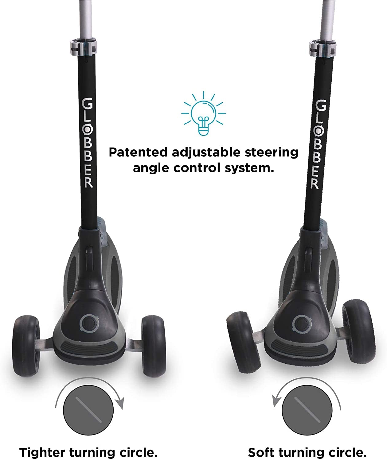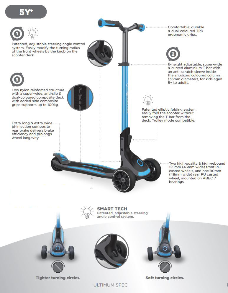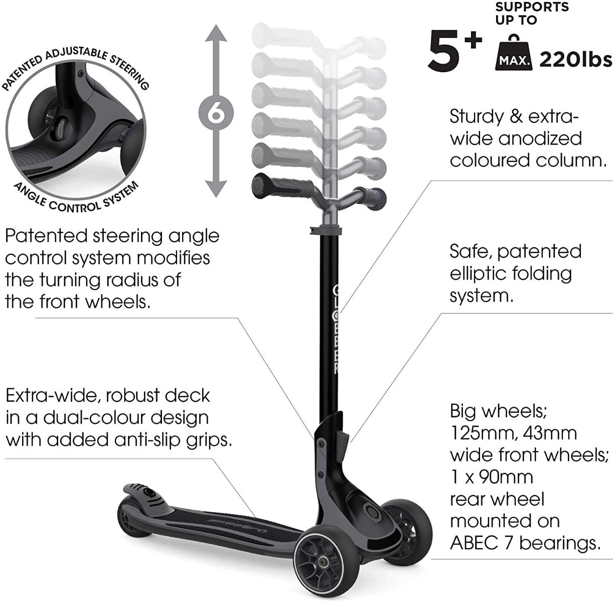 Globber Ultimum Scooter is the biggest, widest and most robust kids scooter from Globber; revolutionising three-wheeled scooters for your little ones over the age of five. The Ultimum scooter has safety at the heart of its design with a patented, adjustable steering angle control system. It allows you to easily modify the turning radius of the front wheels to suit your desired riding style. It can also be taken on the move with the patented folding system, allowing for pack down into trolley mode. The T-bar can be altered to six different heights, means the scooter can grow with your child…perfect for the school run for years to come! Great for kids, teens and adults.