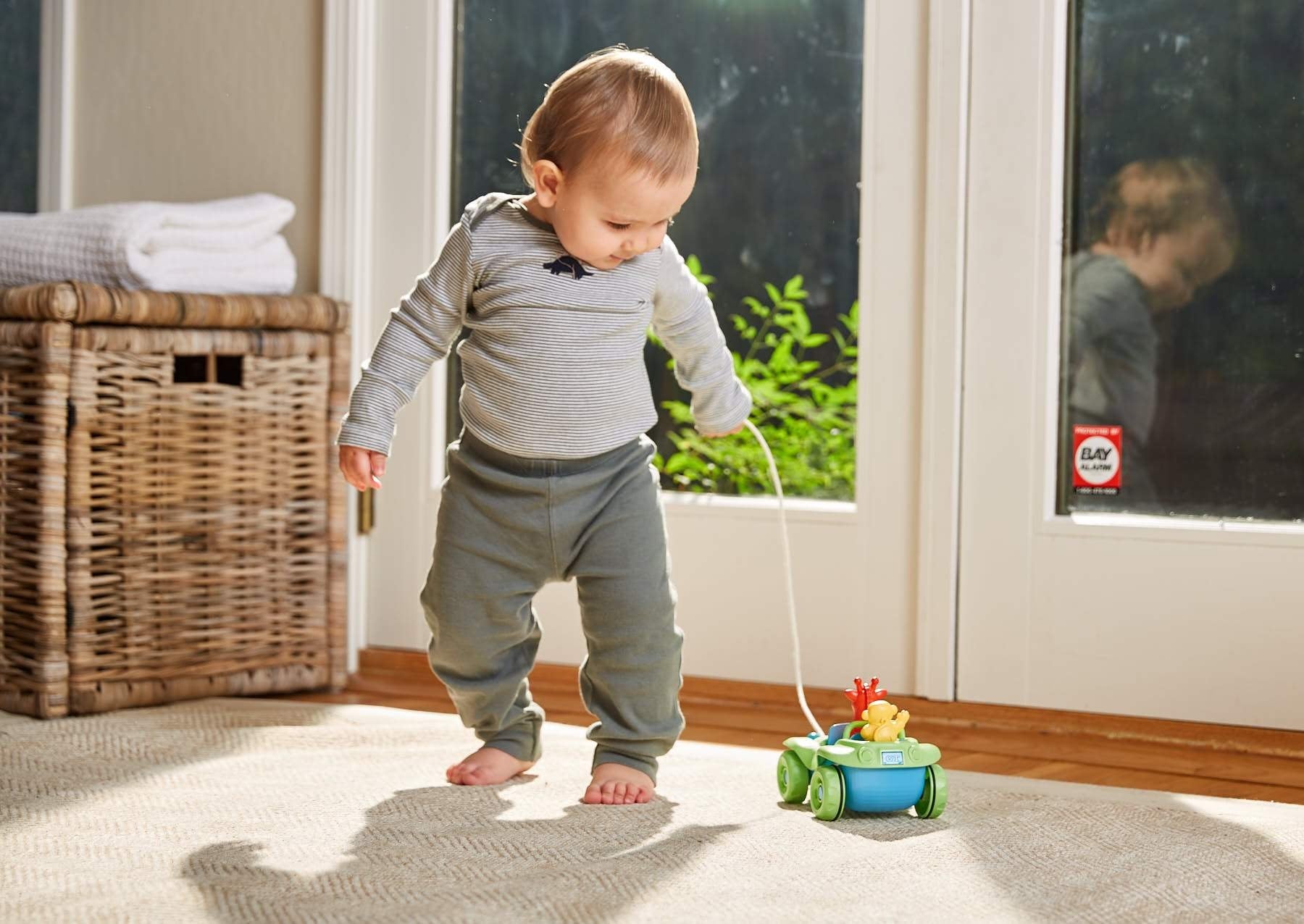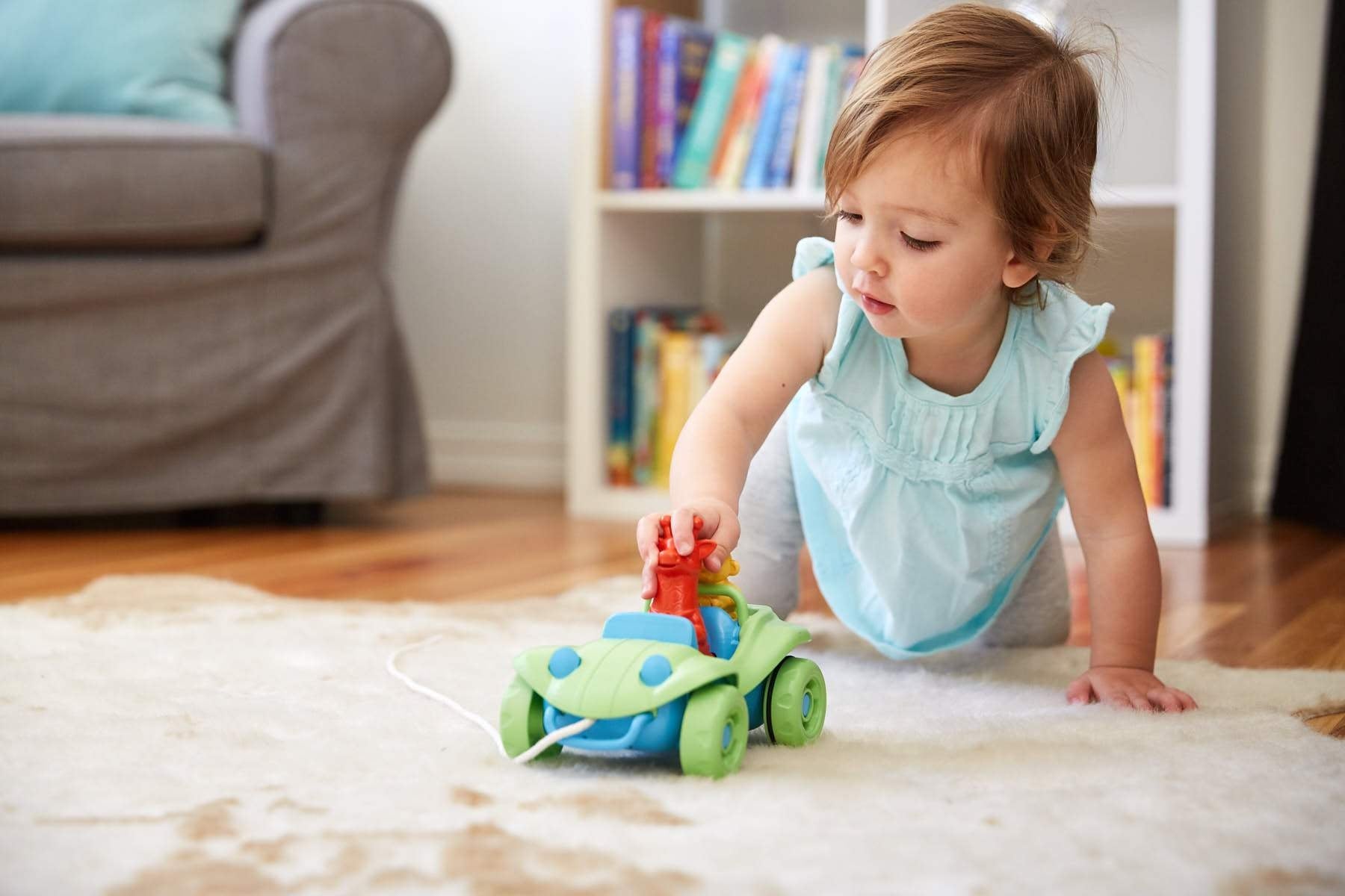 Green Toys Dune Buggy Pull Toy is a chunky, blue and green car pull toy that is the perfect toddler toy to help develop balance and coordination, fine motor skills, and cause and effect reasoning. As the wheels roll, the giraffe driver rocks back and forth, while the monkey in back bounces up and down. Made in the USA from 100% recycled plastic milk jugs and a 100% cotton rope, this super-safe vehicle has no metal axles or small parts. Buckle up for a jungle adventure with the Green Toys™ Dune Buggy!