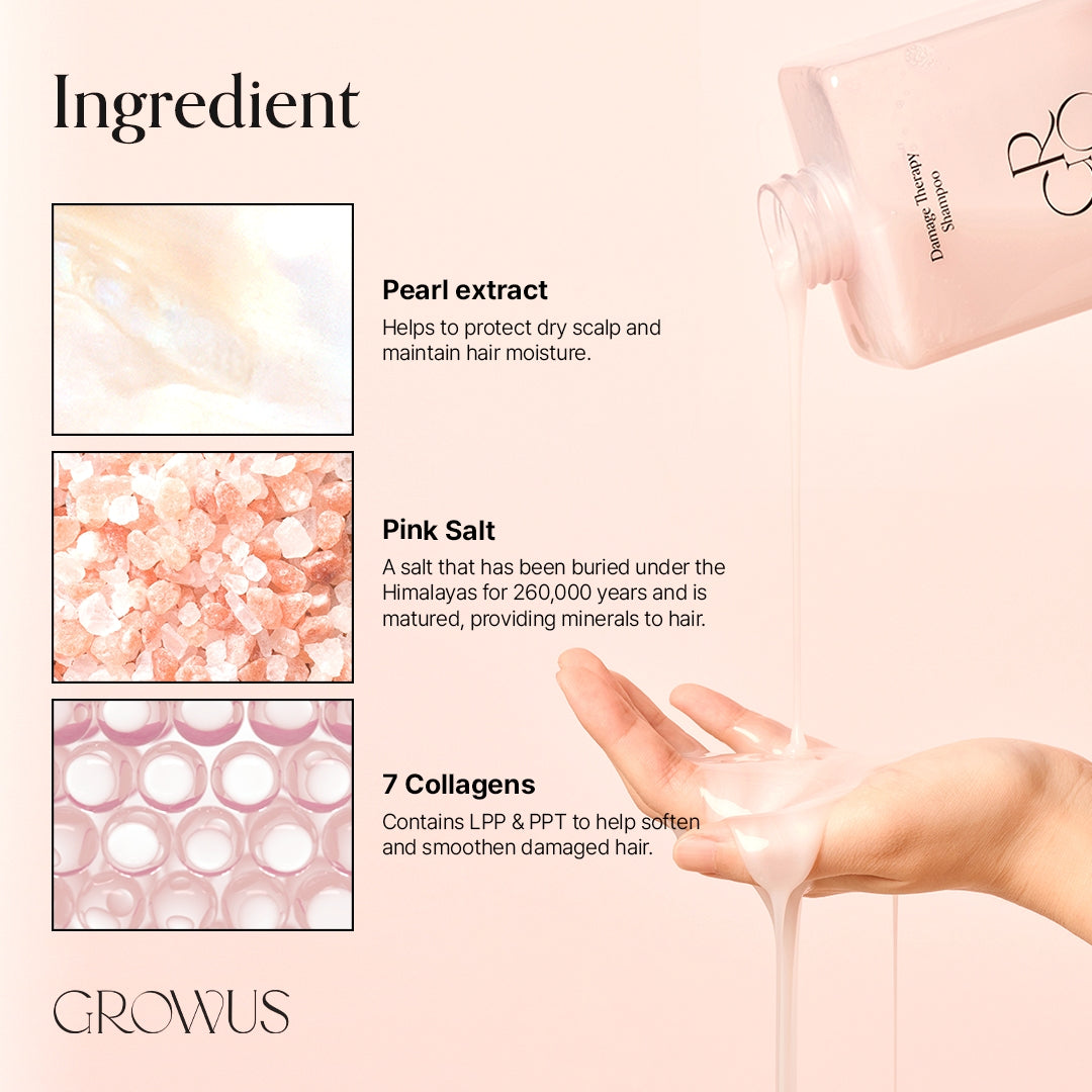 Growus Damage Therapy Shampoo refreshes and revives your hair, thoughtfully crafted to cleanse while restoring strength and shine to damaged strands. Powered by Marine Collagen, mineral-rich Himalayan Pink Salt, and a nourishing Seaweed Complex, this formula gently removes buildup while infusing essential hydration and nutrients. It works to repair dry, rough cuticles and smooth frizz, leaving your hair soft, manageable, and naturally radiant. Ideal for daily use, this shampoo delivers salon-level care and noticeable results from the first wash.