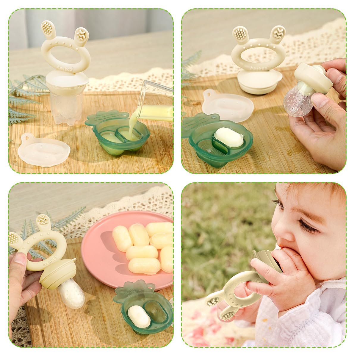 Before first use, disassemble and clean the product before placing silicone components in boiling water for 5 minutes to sterilise. This is to ensure hygiene. Wash before and after each use. Although dishwasher safe, we recommend hand washing with warm, soapy water and rinsing thoroughly. Only soft bristle brushes or soft sponges should be used to clean this product as hard scourers may scratch the surface. Do not use any bleach-based cleaners or tablets to sterilise or clean your Haakaa products. To sterilise after subsequent use, use a steam steriliser or boil in water for 2-3 minutes. To sterilise plastic components (Cap), boil in water for no longer than 2-3 minutes. Silicone may absorb the colours of foods it comes in contact with. To minimise discolouring, wash immediately after use. Do not store near any sharp objects. Store product in a cool, dry place and avoid direct sunlight.