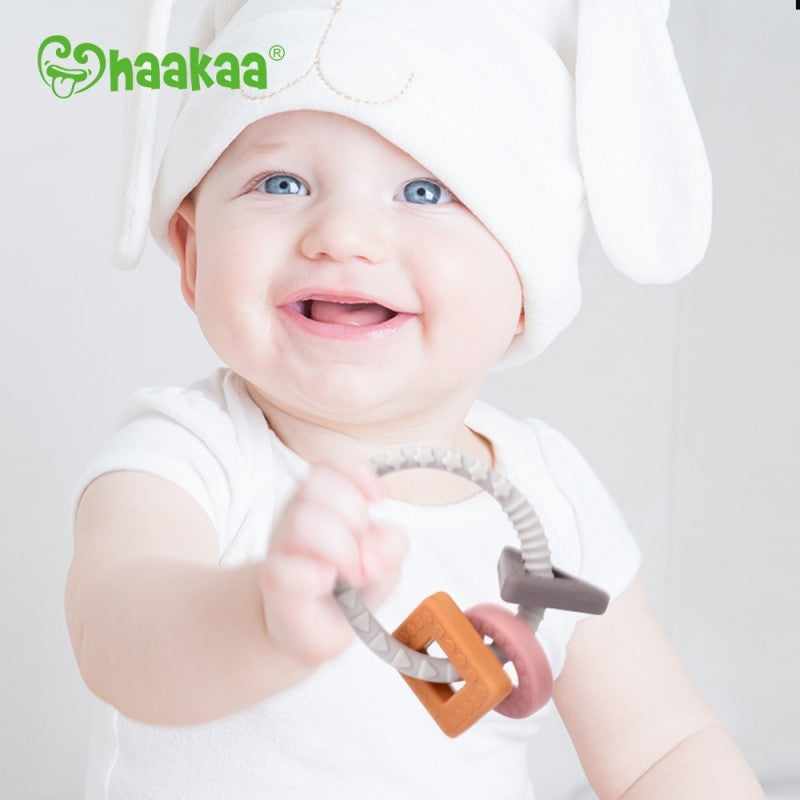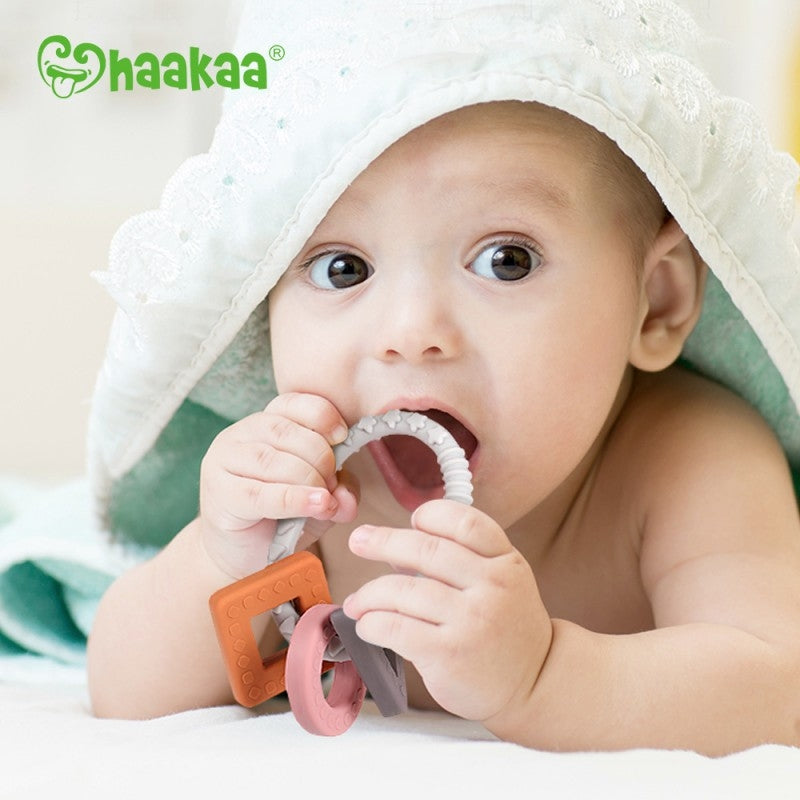 Haakaa Silicone Teething Ring has 3 different textures and 3 textured shapes attached to it, perfect for little ones who are starting to teethe. Our specially-designed Teething Ring is BPA free, FDA approved and made from pliable, food grade silicone. The ridged design helps to develop your baby's motor skills while providing safe, soothing relief from aching gums and new teeth.Its easy-to-hold shape and soft silicone teething parts are thin enough to fit in your baby's mouth while still providing relief. You can also chuck out Teething Ring in the freezer to provide added cooling relief to those little aching gums!