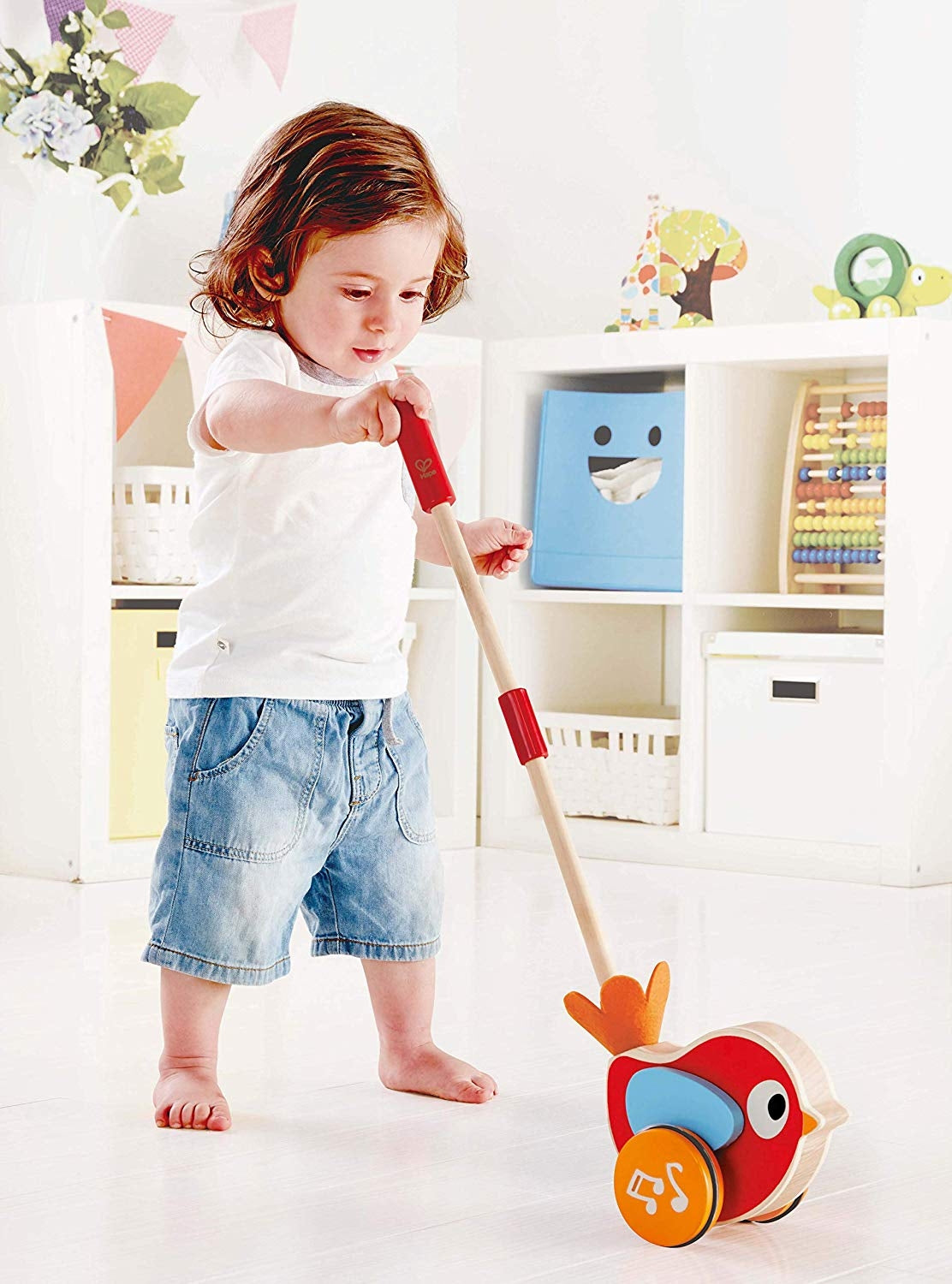 Hape Lilly Musical Push Along Toy is a toy bird on wheels that plays bird sounds as you push it along. Lilly the Bird merrily chirps and moves along as little ones learn to walk and balance. Try to imitate different bird sounds as you walk and push along Lilly the bird!