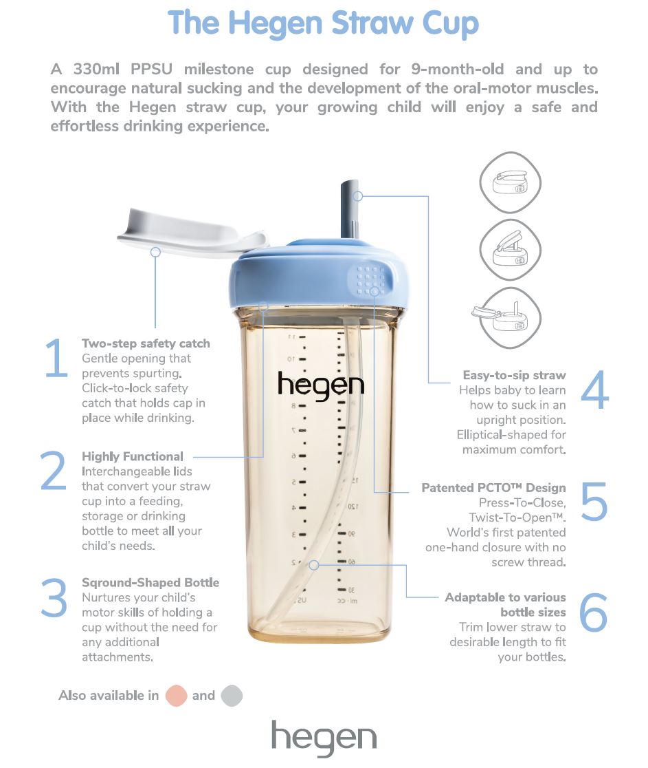 Hegen PCTO™ Straw Cup PPSU, 330ml/11oz comes with a unique click-to-lock safety cap prevents liquid from spurting and holds the cap in place so your child can drink easily. Learning to sip from a straw has never been this easy. First of its kind in Singapore. Designed without a bite valve, our straw allows little ones to sip with ease, encourages good dental health and guides them to master the technique of sipping. Perfect for children aged 9 months and above or toddlers transitioning from milk bottle feeding to straw cups for babies! However, you can also start training your babies from as young as 6 to 7 months old.
