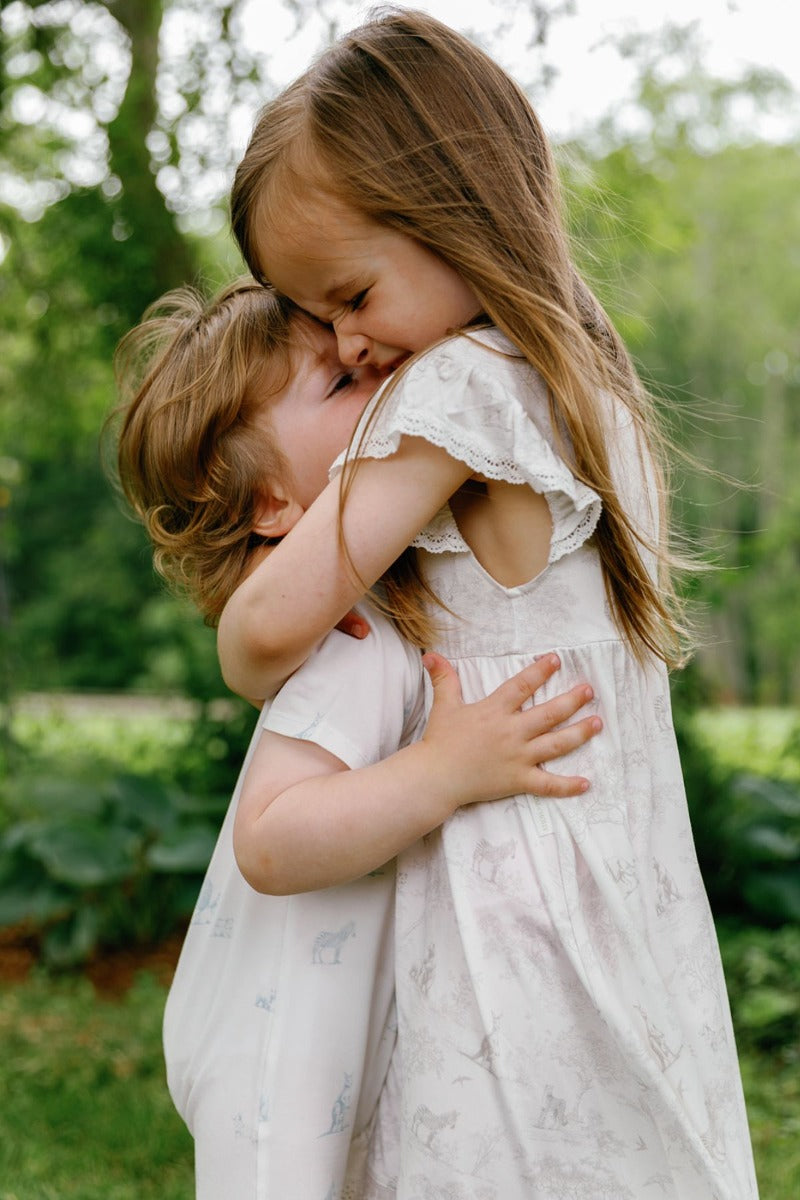 House of Holly Flutter Broderie Dress is a little dress for big imaginations. Our Flutter Broderie Dress is made for twirls, giggles, and golden childhood memories. Styled with flutter sleeves and a gently flared shape, this dress is finished with delicate broderie trims and crafted in buttery-soft bamboo fabric that’s breathable and gentle on skin. The print captures Holly on a journey through the wild—lions laze, cheetahs prowl, and kangaroos bounce across a soft backdrop of hand-illustrated magic.