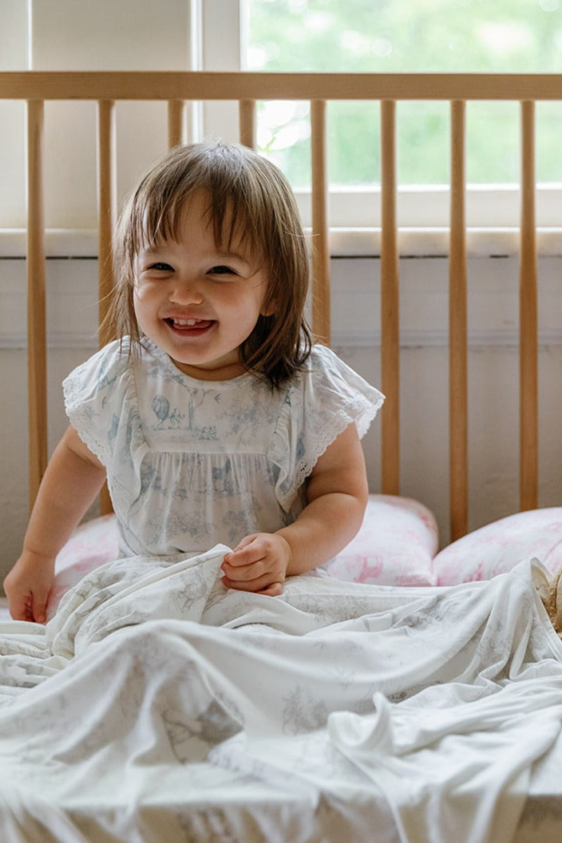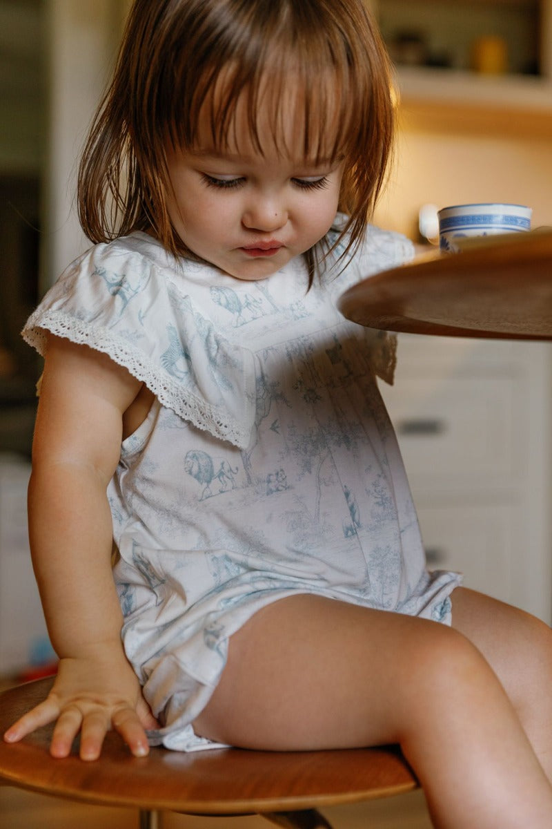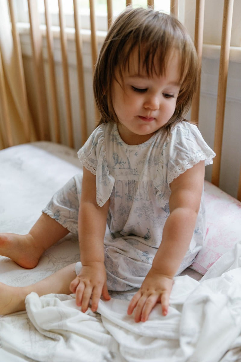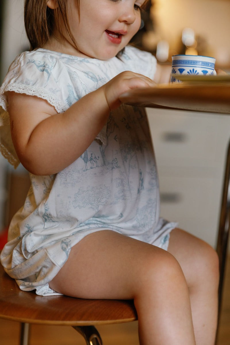 House of Holly Flutter Broderie Romper lets your little one roam wild and free in this dreamy romper, part of our Wild Toile collection—a whimsical twist on classic toile de Jouy. Crafted in our signature soft bamboo blend, this mid-thigh romper features delicate flutter sleeves that drape gently off the shoulders, finished with dainty broderie trim for an extra touch of charm. Designed with a relaxed bubble silhouette for comfort and breathability, it’s perfect for warm days and even warmer cuddles.