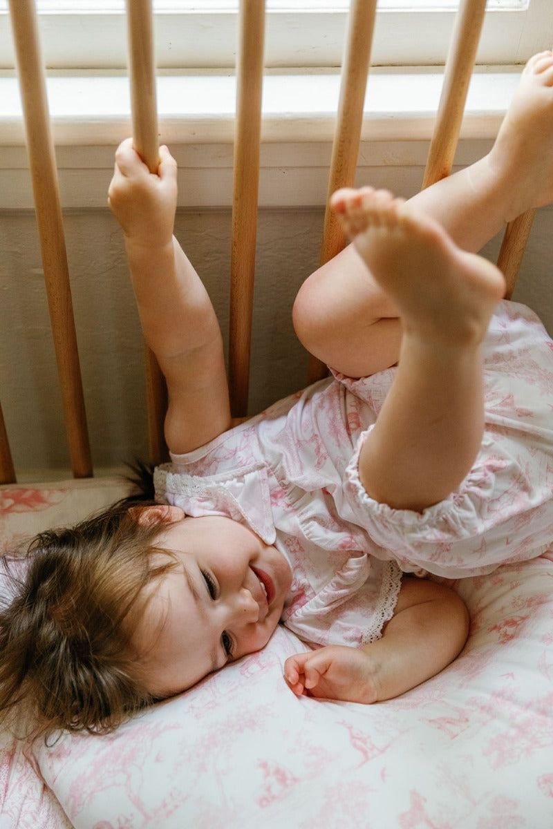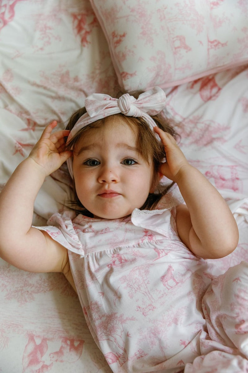 House of Holly Flutter Broderie Romper lets your little one roam wild and free in this dreamy romper, part of our Wild Toile collectionβa whimsical twist on classic toile de Jouy.Β Crafted in our signature soft bamboo blend, this mid-thigh romper features delicate flutter sleeves that drape gently off the shoulders, finished with dainty broderie trim for an extra touch of charm. Designed with a relaxed bubble silhouette for comfort and breathability, itβs perfect for warm days and even warmer cuddles.Β