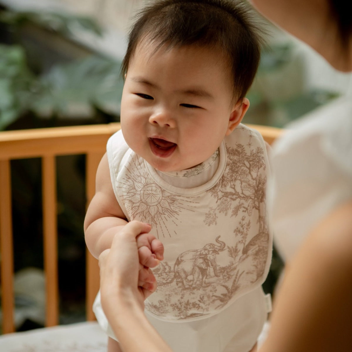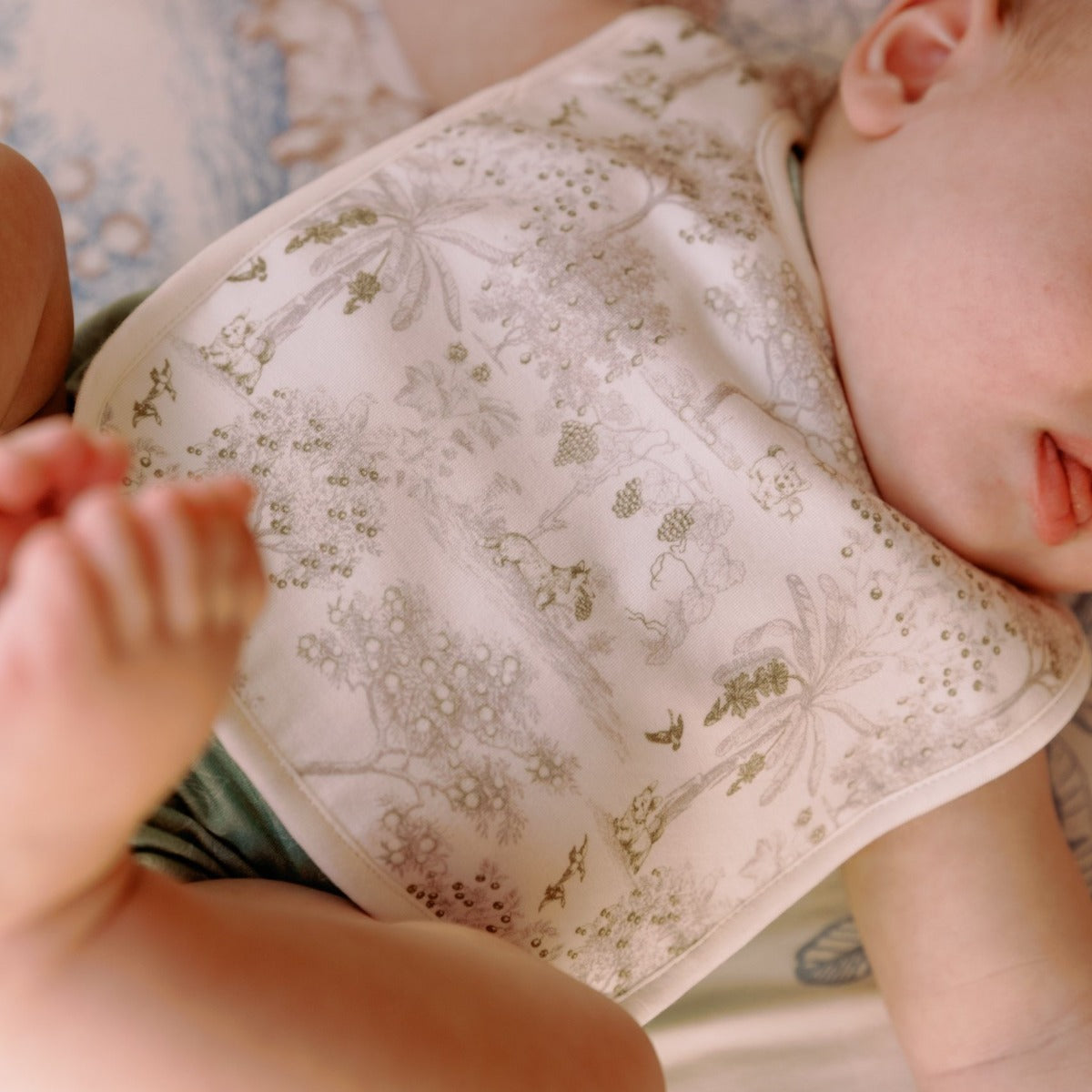House of Holly Reversible Drool Bib is a double-sided bib that is the ultimate solution for keeping your little one clean, dry, and stylish. Crafted with the utmost care and attention to detail, these bibs offer a level of comfort and functionality that will make drool sessions and everyday adventures a breeze. On one side, you’ll find a sumptuously soft and breathable bamboo fabric that’s gentle on your baby’s skin, ensuring they stay cozy and irritation-free. On the flip side, we’ve incorporated bamboo terry towel for unparalleled absorbency, tackling even the messiest of spills effortlessly.But it’s not just about function – our bibs are also designed to make a fashion statement. The front features an exquisite Toile de Jouy print, showcasing Holly’s exciting journey through the garden. This whimsical design adds a touch of elegance to your baby’s attire, making them the most stylish little explorer around.