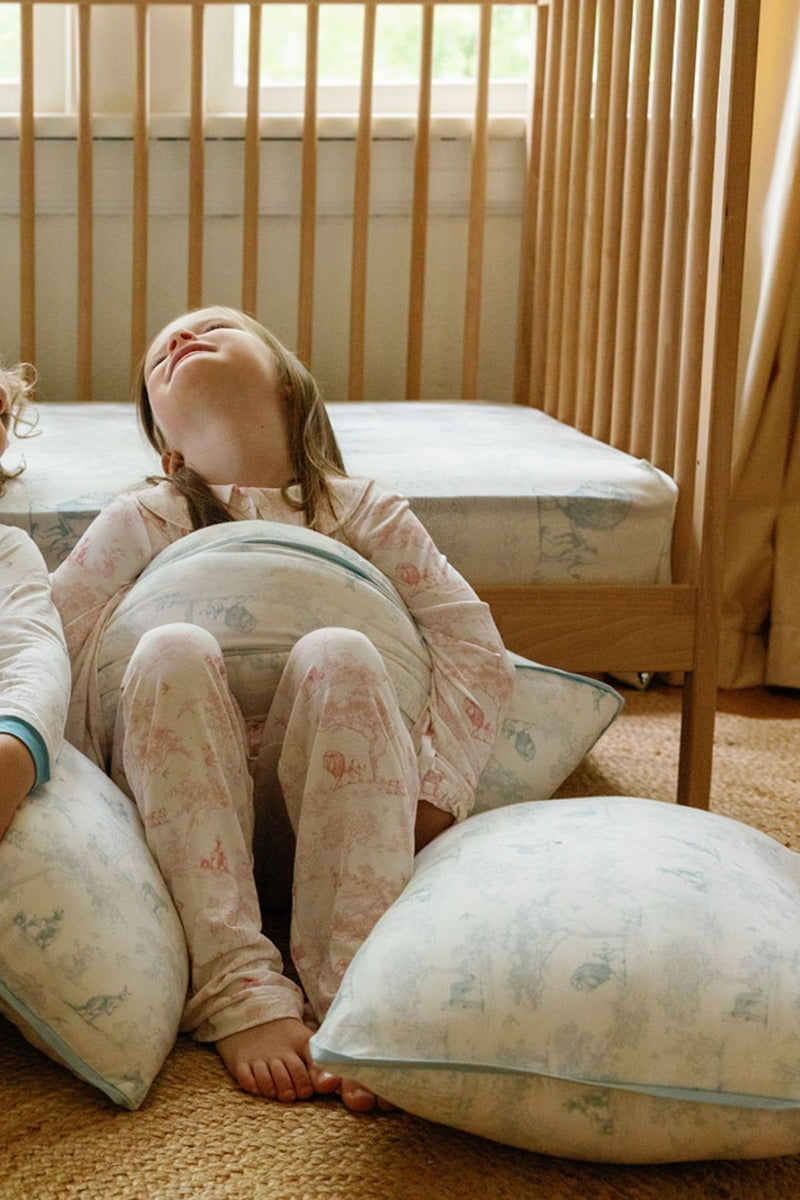 House of Holly Rounded Collar Long Sleeve PJ Set brings a gentle charm to bedtime, designed for little ones who love to curl up in softness and story. The long-sleeved top features a soft rounded collar and delicate gatherings at the chest, giving it a sweet silhouette that’s both playful and timeless. Paired with relaxed straight-cut pants, this two-piece set offers comfort for all-night dreaming and cosy morning cuddles. The Wild Toile print tells a soft story of Holly and her wild companions—lions, bears, zebras, and kangaroos—nestled gently into hand-drawn details.
