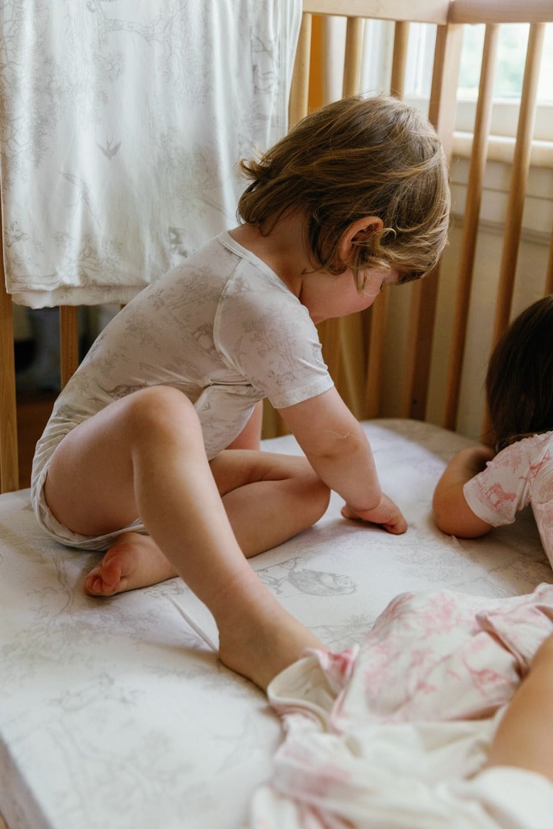 House of Holly Wrapover Onesie is inspired by traditional wrap silhouettes, designed for babies who love to stretch and snuggle. A part of our Wild Toile collection, the wrap-style front with soft ties offers gentle coverage for delicate newborn tummies while allowing ease of wear. The bamboo fabric is luxuriously soft and naturally breathable—perfect for daily lounging or dreamy naps. Each print tells a little tale—Holly wanders through the wilderness, surrounded by sweetly illustrated lions, zebras, cheetahs, bears, and kangaroos.