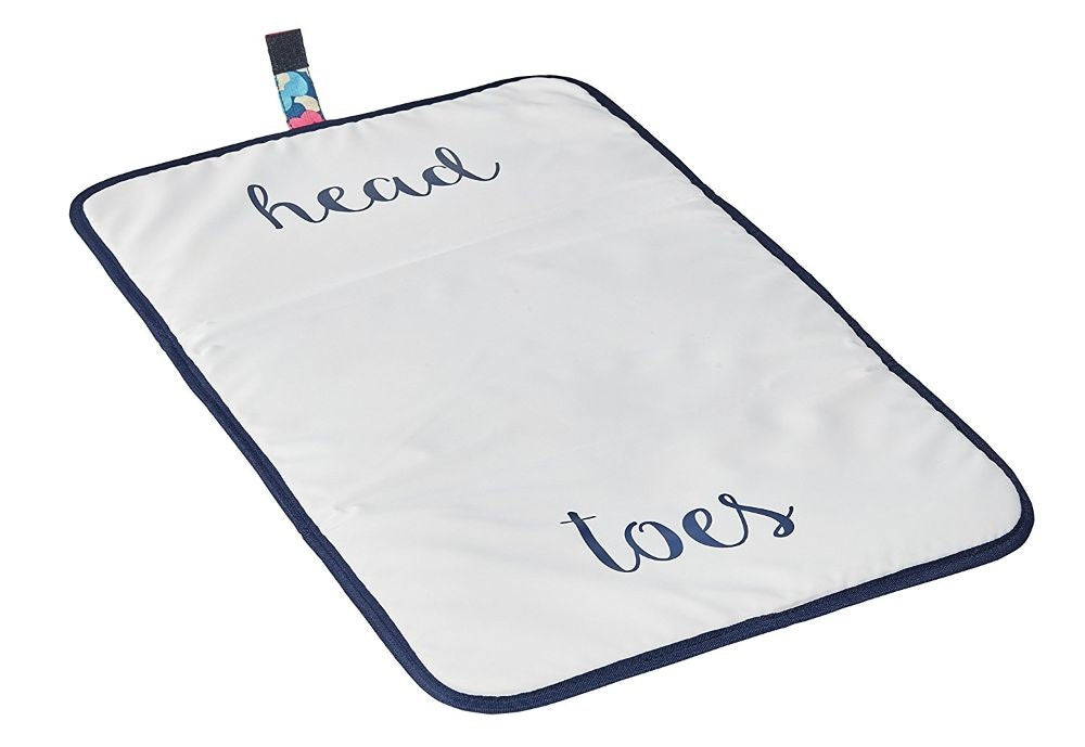 - Coordinating easy wipe changing pad included with whimsical "head" and "toes" printed on the inside.