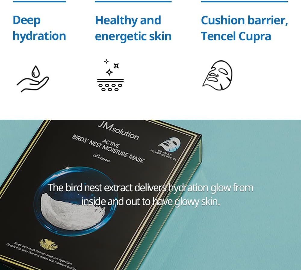 JMsolution Active Bird's Nest Moisture Mask is a pack of 10 sheet masks that is enriched with abundant & deep moisturizing, bird's nest extracts. Energetic care, high moisturizing essence provides high moisturizing and soothes skin for a healthier look. Water barrier tencel sheet cellulose tencel sheet gives comfort to the skin which helps maintain a rich moisturizing sensation.