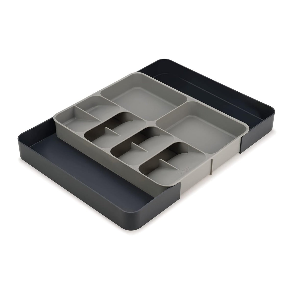 Joseph Joseph DrawerStore Expanding Cutlery, Utensil & Gadgets Organiser has a unique design that features five overlapping compartments for storing cutlery and two deep-sided compartments for holding gadgets so you can easily organise messy cutlery and utensil drawers. A highly practical storage solution.