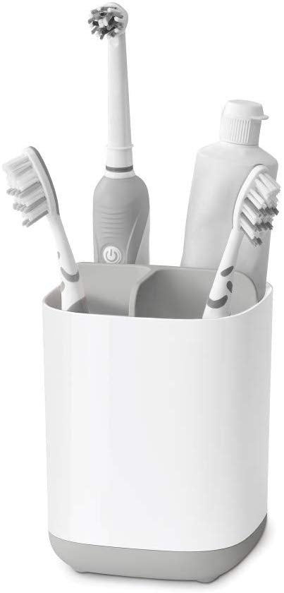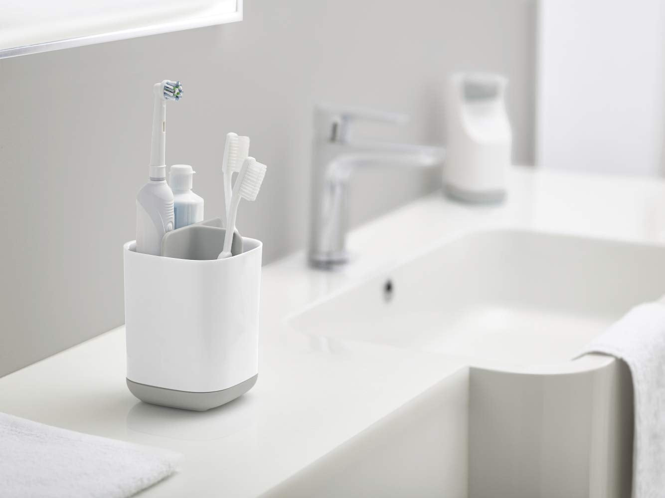 Joseph Joseph EasyStore Toothbrush Caddy is a versatile toothbrush holder with plenty of space to store both your toothbrushes and toothpaste. Keep your bathroom sink neat and tidy. These neat toothbrush caddies are divided into several sections providing organised storage for a range of oral care items including manual/electric toothbrushes, toothpaste tubes and dental floss.