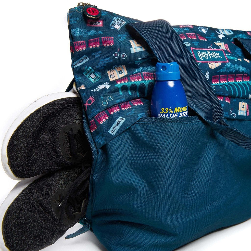 Jujube All That Tote Harry Potter Diaper Bag - Platform 9 3/4 is a functional, lightweight, and durable tote. A size bigger than the Be Light, it has a striking color-blocked front panel and sturdy, germ-resistant polyester fabric. This unique overlap conceals a huge multipurpose side pocket perfect for storing shoes after the gym, doubling as a wet bag, or functioning as a reusable shopping bag for groceries! The main pocket is equally innovative, with a large interior pocket, water bottle pocket, and breathable mesh panel construction! Jujube's signature features are all present; semi-structured bottom panel increases carrying capacity while also enabling the bag to maintain its shape while standing!