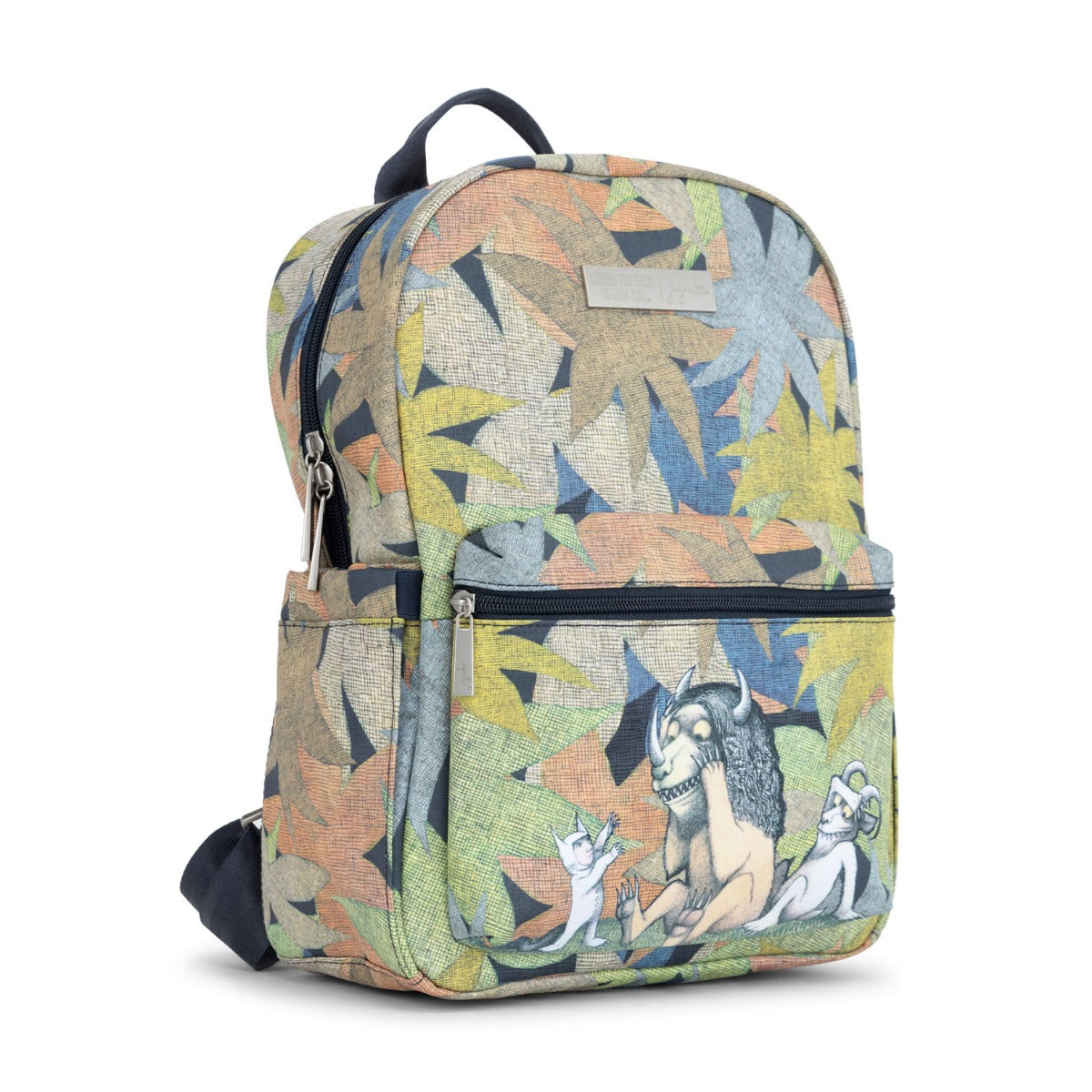 Let the wild rumpus start!” Where the Wild Things Are collabs with JuJuBe to bring to life a beloved storybook by Maurice Sendak. This wild print features iconic scenes atop overlapping leaves in traditional earthy colors. Shades of green, blue, tan, brown, and yellow grow and grow and grow until they envelop every corner of this imaginative print. Find a different illustration screen printed on each bag (excluding the Be Dapper). The lining highlights classic vignettes with Max and the Wild Things as they decorate the twilight blue skies, stars, and moons. Paired with brushed antiqued brass hardware, Where the Wild Things Are will have you howling, dancing, climbing and parading until it’s time to go back to your room and eat your supper (which will still be warm.)