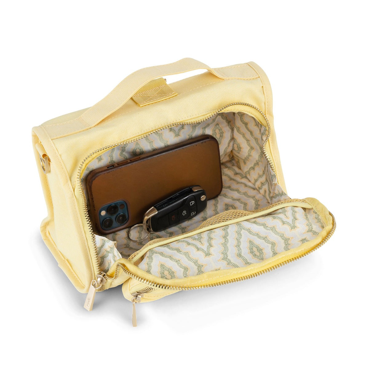 Rise and shine with the soft yellow of Sunbeam. Inside this warm chromatics pastel, you'll find our coordinating Dotted Diamonds lining created by indigenous artist Ramesh Katara. Inspired by kernels of maize - the Bhil's staple crop, Dotted Diamonds features "pointillist" dot joins another to in wavelike rippled from one diamond to the next. Various shades of muted yellows and greens are skillfully painted into a symphony of multi-hued and rhythemic dots symbolizing stories, prayers, ancestors, memories and traditions. Adored with satin gold hardware, this print echoes indigenous brillance from generations past to present.