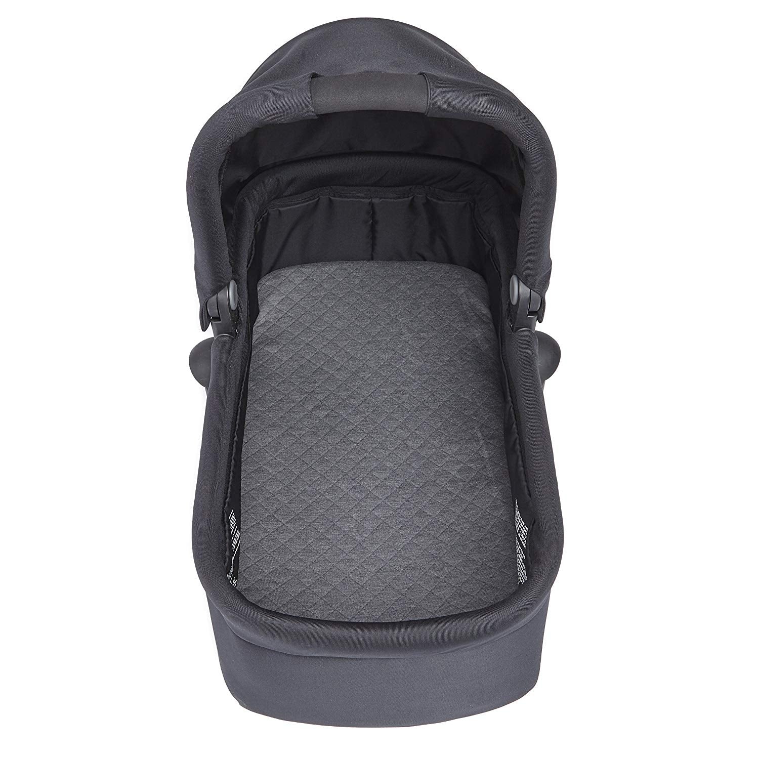The bassinet features a machine washable quilted mattress pad, large sun canopy, and a boot cover to protect your baby from the elements.