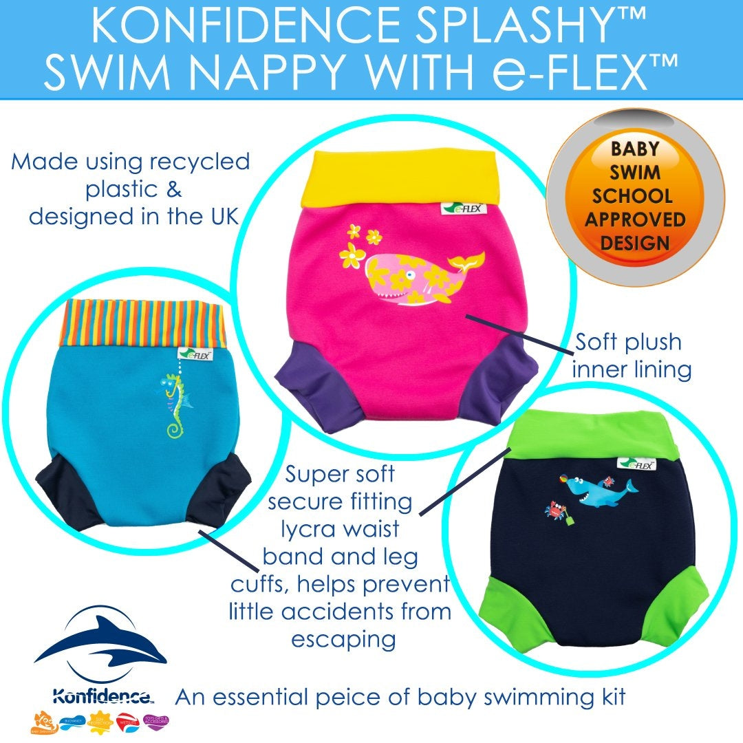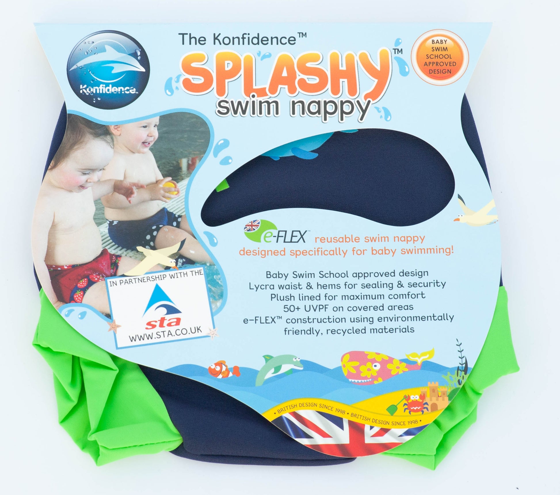 Konfidence E-Flex Splashy Swim Nappy is a swim nappy that is soft, flexible and secure round the waist and leg hems and made of recycled materials. Designed to swim school approved format in Cornwall and in partnership with the Swimming Teachers Association it’s the essential baby swimming product for use at home, on holiday in the pool or beach or in baby swim classes.
