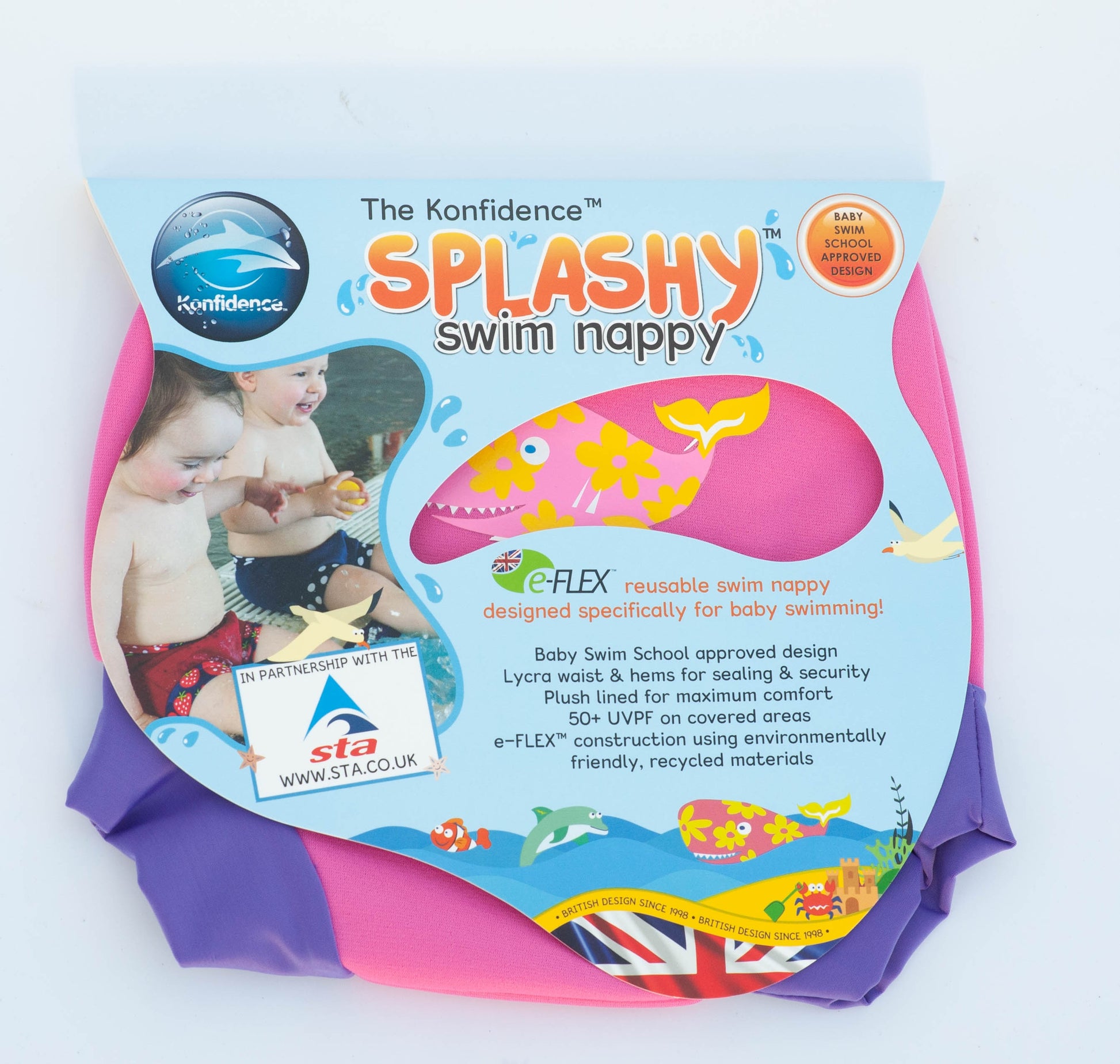 Konfidence E-Flex Splashy Swim Nappy is a swim nappy that is soft, flexible and secure round the waist and leg hems and made of recycled materials. Designed to swim school approved format in Cornwall and in partnership with the Swimming Teachers Association it’s the essential baby swimming product for use at home, on holiday in the pool or beach or in baby swim classes.