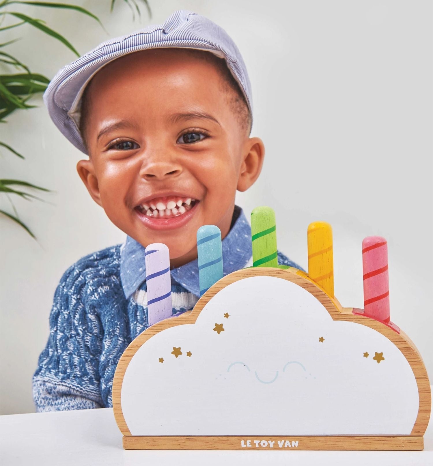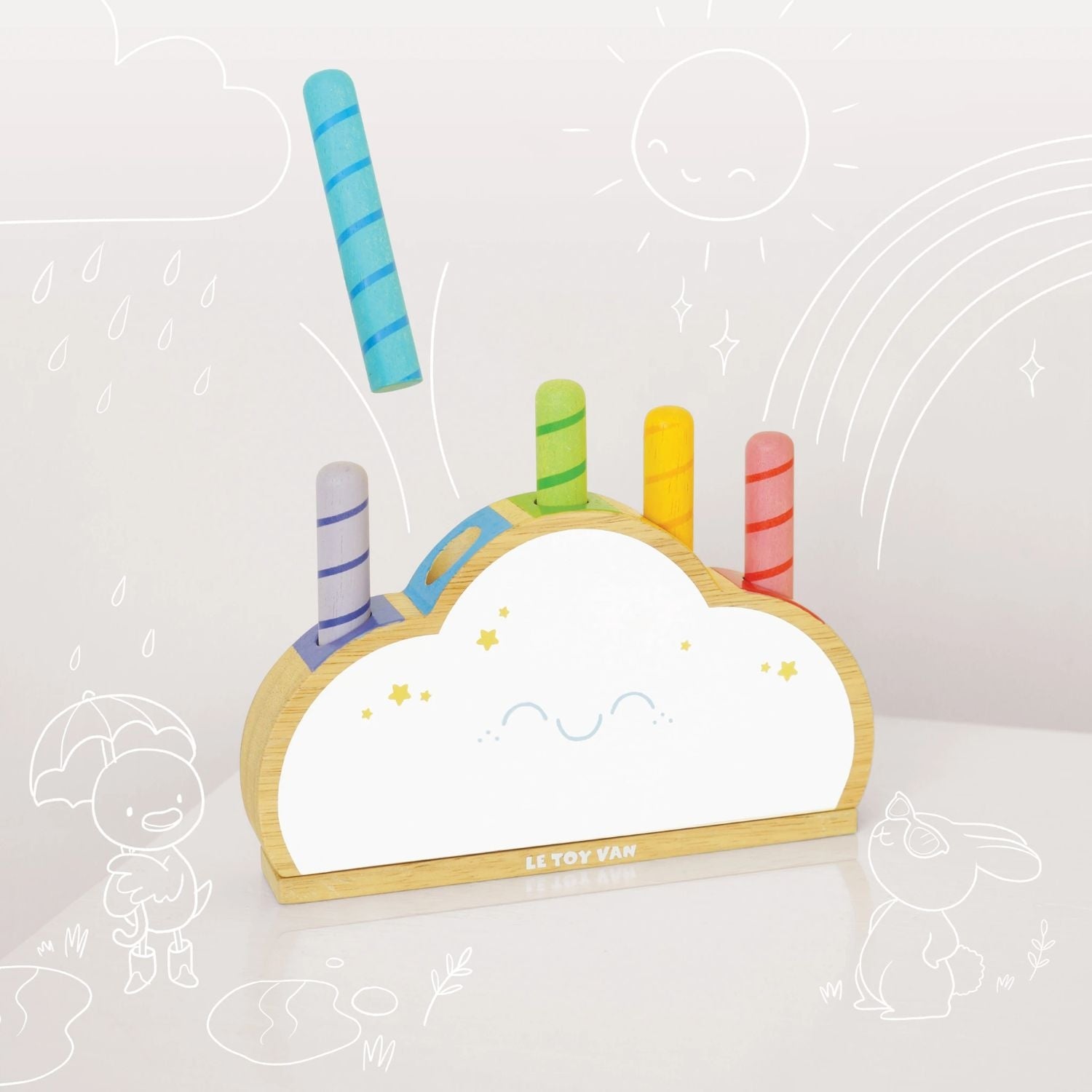 Le Toy Van Rainbow Cloud Pop Wooden Sorter is a solid spring loaded wooden cloud, featuring five colourful rainbow pop-up rods (in three heights). Made from rubber-wood complemented by pastel water based painted colours and hand finished details. Mix and match the rods to the corresponding colours or take it to the next level: push-pop-catch!