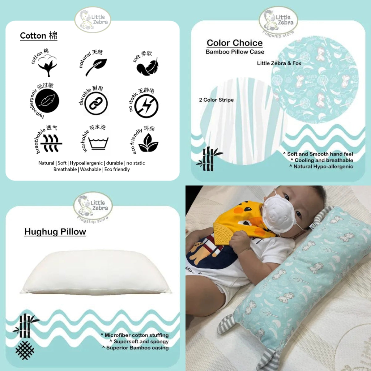 Little Zebra Hug Hug Pillow Set is a warm, comfortable and fluffy pillow that is great for cuddling! The perfect companion when playing, sitting or lying down. The pillow stuffing comprises spongy microfiber cotton that is wrapped with premium bamboo spandex fabric to ensure smoothness and softness. The Hug Hug pillows and pillowcases are specially designed with extra little tabs of ears and tail that promote concentration and fine motor skills. Great to have for your little ones' habit of touching and playing!