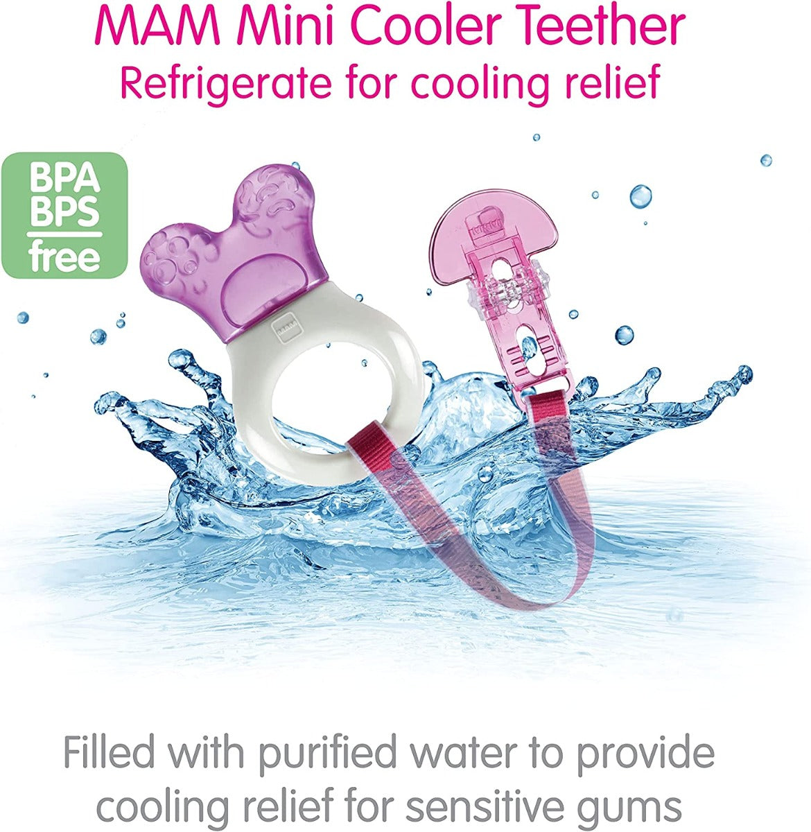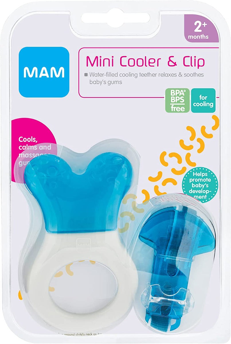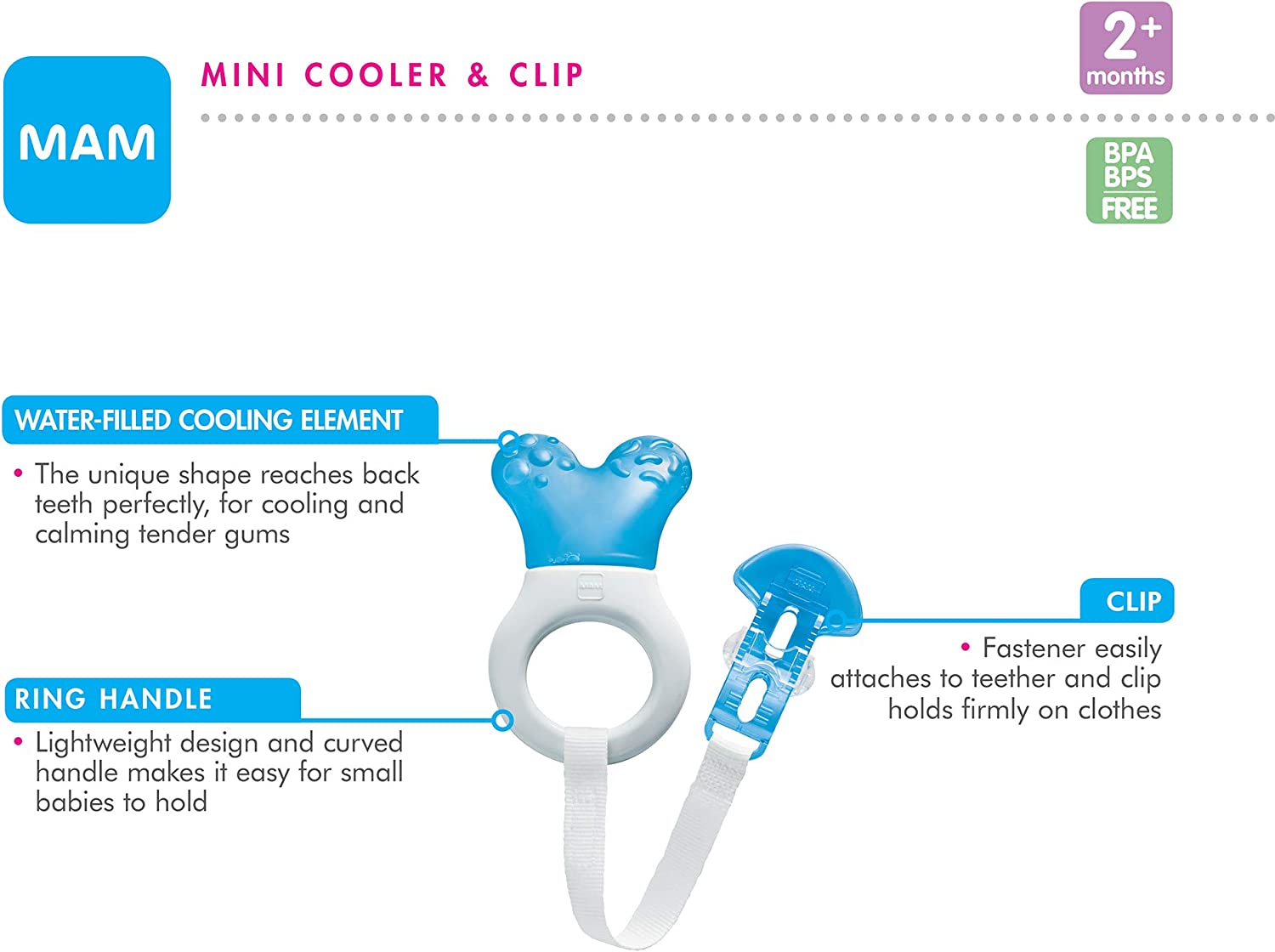 MAM Mini Cooler & Clip is a purified water-filled teether designed to soothe baby's sore gums. Features unique shapes and textures to effectively relieve baby teething symptoms and foster baby’s sensory skills. Our MAM Cooler teething toys are uniquely shaped to provide relief for back teeth in those hard-to-reach places. Lightweight design and curved ring make it easy for babies to hold and use by themselves.
