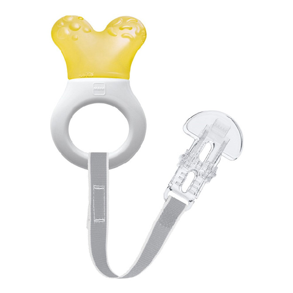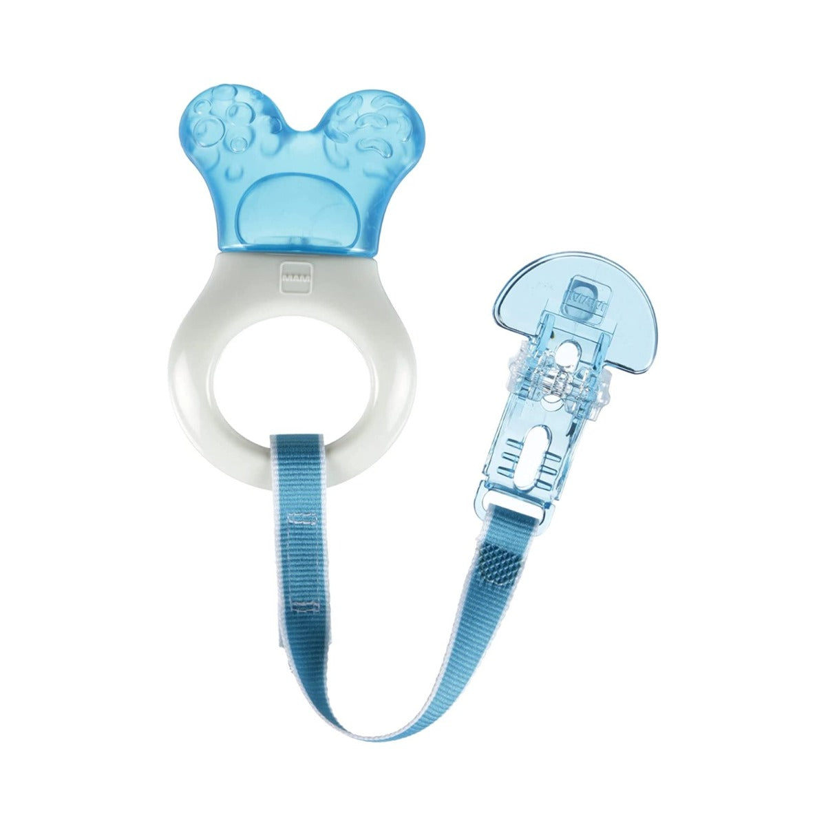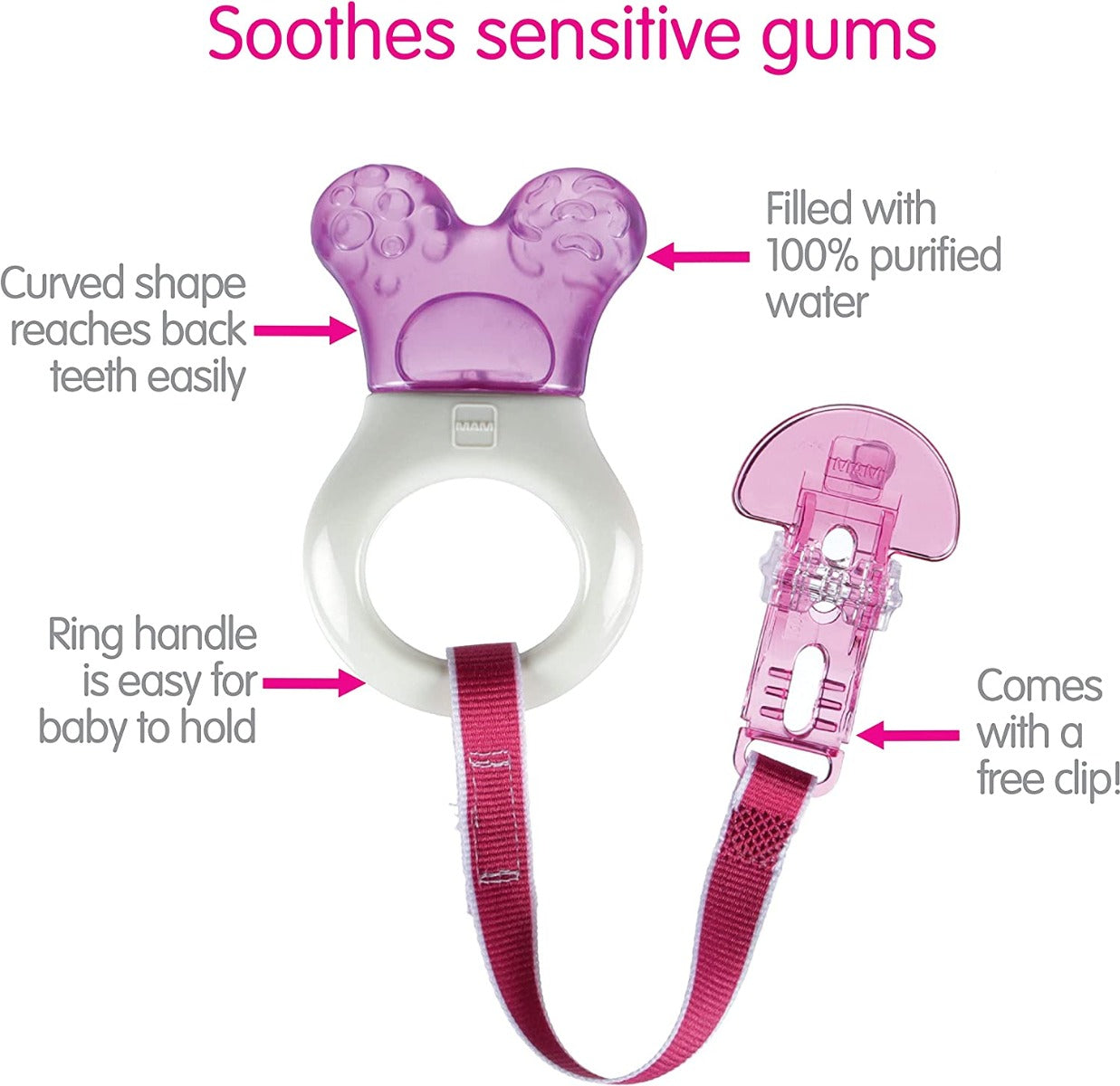 MAM Mini Cooler & Clip is a purified water-filled teether designed to soothe baby's sore gums. Features unique shapes and textures to effectively relieve baby teething symptoms and foster baby’s sensory skills. Our MAM Cooler teething toys are uniquely shaped to provide relief for back teeth in those hard-to-reach places. Lightweight design and curved ring make it easy for babies to hold and use by themselves.