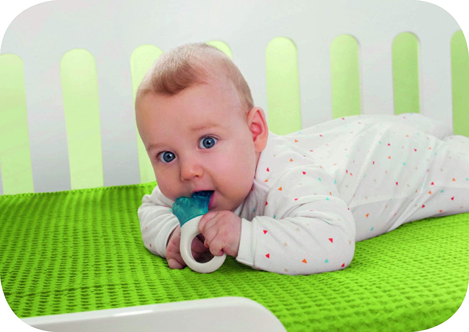 Unique shape reaches back teeth perfectly. Cools & calms. Biting structures massage sensitive gums.