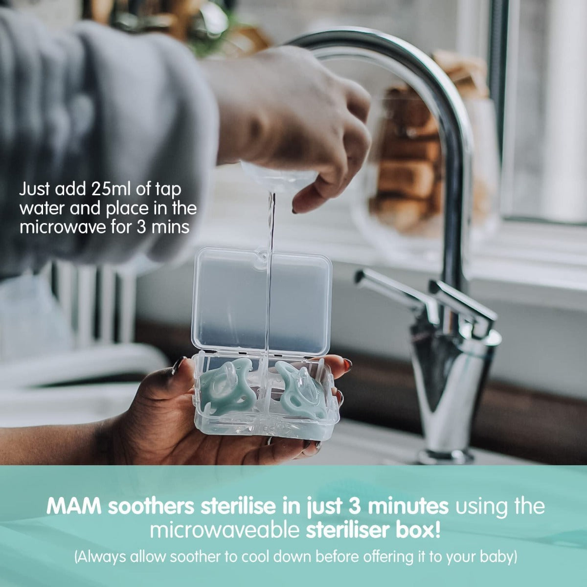 MAM Original Start Pacifier with Case is a pack of two soothers that is developed by leading pediatric dentists and developmental psychologists to provide maximum comfort and style for babies. MAM Original Baby pacifier has a unique curve with large air holes and dimples on the inside to make babies feel comfortable and relaxed. These cutting-edge pacifiers combine technological innovation and trendsetting design to help give babies a healthy start in life and promote healthy oral development. Features a symmetrical nipple that for baby naturally flattens and extends when sucked, mimicking a human nipple during breastfeeding. MAM’s medically silicone pacifiers feature life-like, SkinSoft textured silicone that feels more natural, just like mom.
