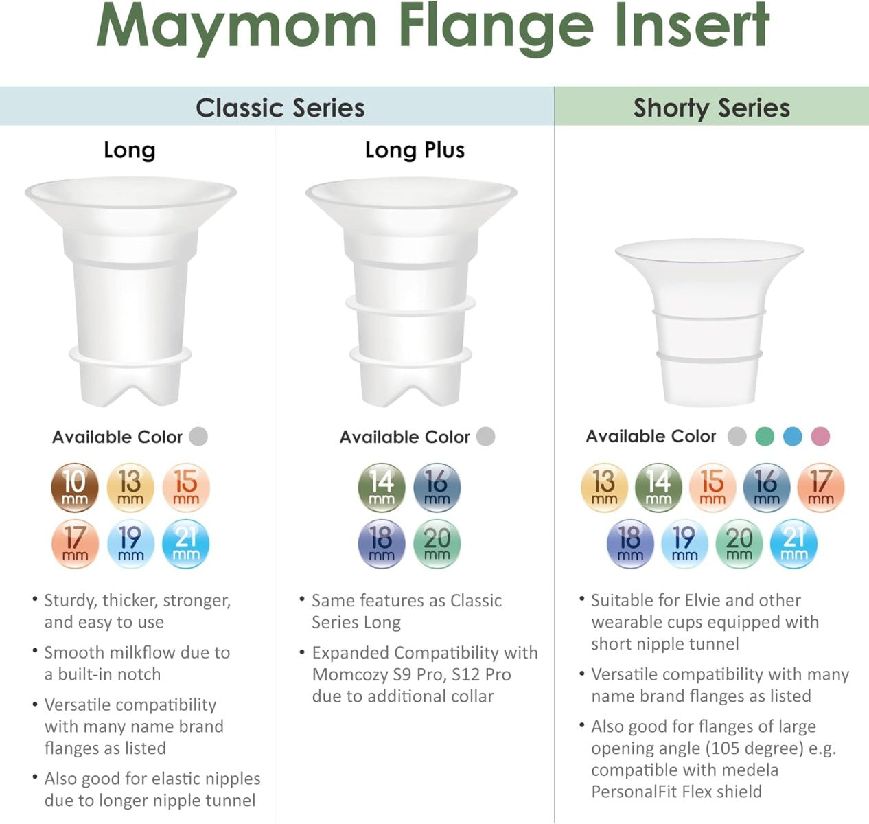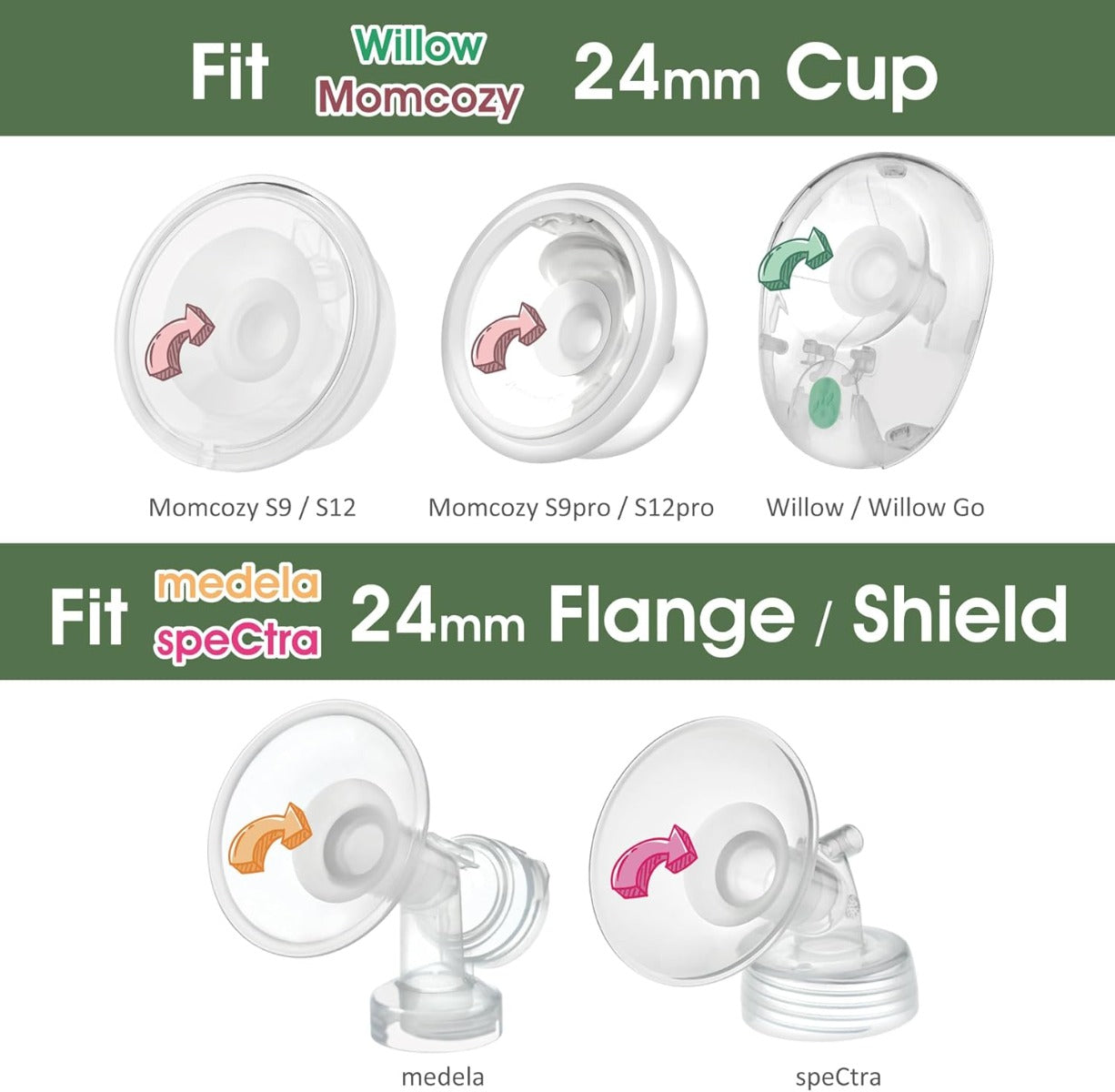 Maymom Flange Inserts for 24mm Spectra & Medela PersonalFit Shield (Long Plus) is a pack of two inserts that are compatible with Freemie 25mm Cup, Medela 24mm PersonalFit shield, Spectra 24mm flanges , Ameda Purely Yours 25mm flanges, Ameda Mya Joy 25mm flanges, Willow 24mm flanges, Lansino 24mm flanges, compatible with Momcozy S9/S10/S12 Wearable Breastpump 24 mm cups (not for 27 mm cups), LegendaryMilk/Tsrete Wearable 24mm silicone cups.Β
