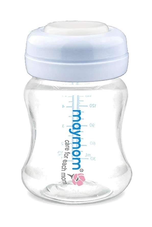 Maymom Wide-Neck Milk Bottle with SureSeal Silicone Disc is a wide-neck milk bottle from Maymom with a collar and a sealing disc. Use it to store, feed and pump milk. The SureSeal silicone disc protects against milk leakage.
