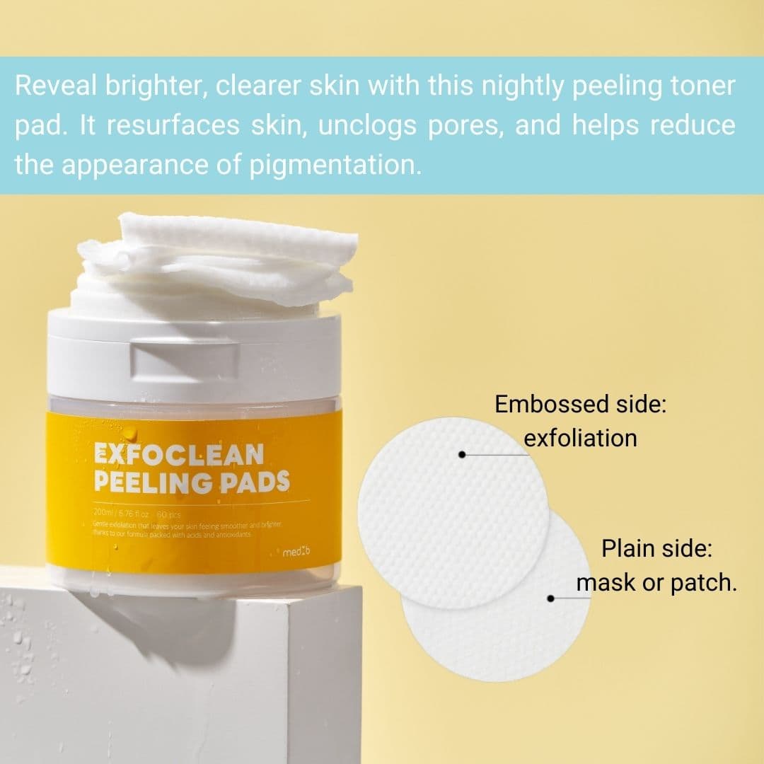 Med B Exfoclean Toner Pads are designed for exfoliation and skin cleansing. They help remove dead skin cells, impurities, and excess oils while balancing the skin's moisture. These pads provide a gentle exfoliation to improve skin texture and radiance. Its effective yet mild formula, making it suitable for various skin types.