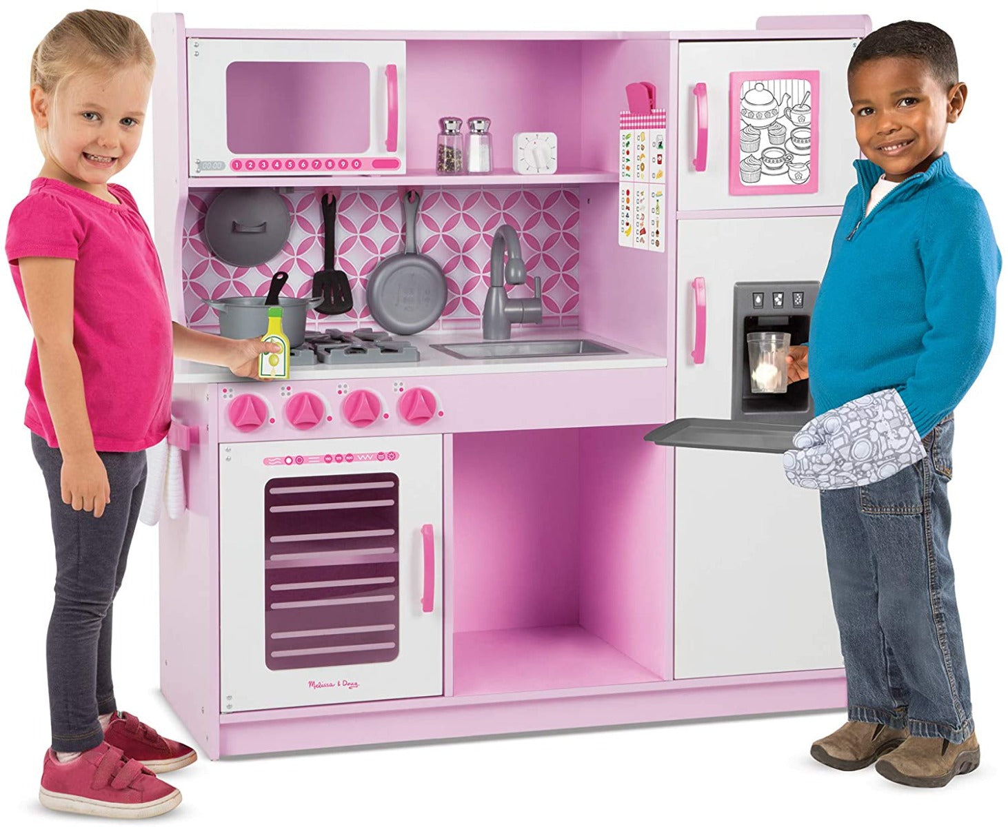 Melissa & Doug Chef's Kitchen - Cupcake is a beautifully designed smal-sized kitchen in pretty pink. The easy to assemble chef's kitchen includes a refrigerator/freezer with working ice maker that dispenses two included "ice cubes," an oven and stovetop with dials that turn, microwave with turning plate, sink with moving faucet and handle, grocery check list, movable hooks, and ample shelving and storage. Detailed, illustrated instructions make this kitchen simple to put together. Assembled, it stands approximately 3.5 feet (1 meter) long and more than three feet (0.9 meters) high. Sturdy, top-quality wooden construction means it will stand up to years of creative make-believe meal-making! Accessories sold separately.