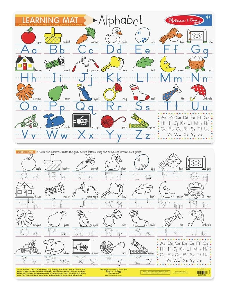 Melissa & Doug Learning & Writing Mat is a table mat for kids to learn to write alphabets. Introduce the alphabet and words in a fun and engaging way. This is a double-sided mat, one side with pictures and alphabet, the other side for kids to draw on. Use only No.2 pencils (not included) or Melissa & Doug Learning Mat Crayons (not included, click here!) . Play becomes active learning--and mastering these important academic skills becomes as easy as A, B, C and 1, 2, 3!
