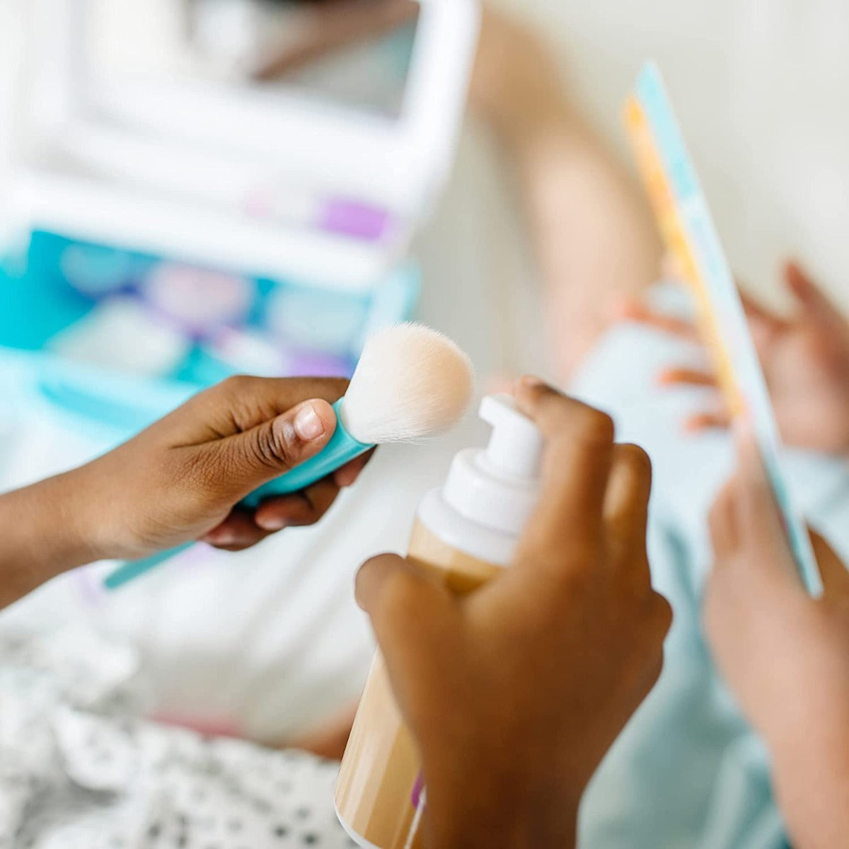 Melissa & Doug Love Your Look Makeup Kit Play Set is a 16-piece play set that gives kids everything they need to play makeup artist and to practice daily skincare and makeup routines! Application brushes and play accessories for eyes, lips, and face, including an empty foundation pump bottle, compacts for pretend blush, powder, and glitter, pretend gloss and lipsticks, and a play eye shadow palette, let kids imagine different looks. Accessories look real but are toys--items do not contain cosmetics and no colour is transferred, giving countless hours of mess-free imaginative play!