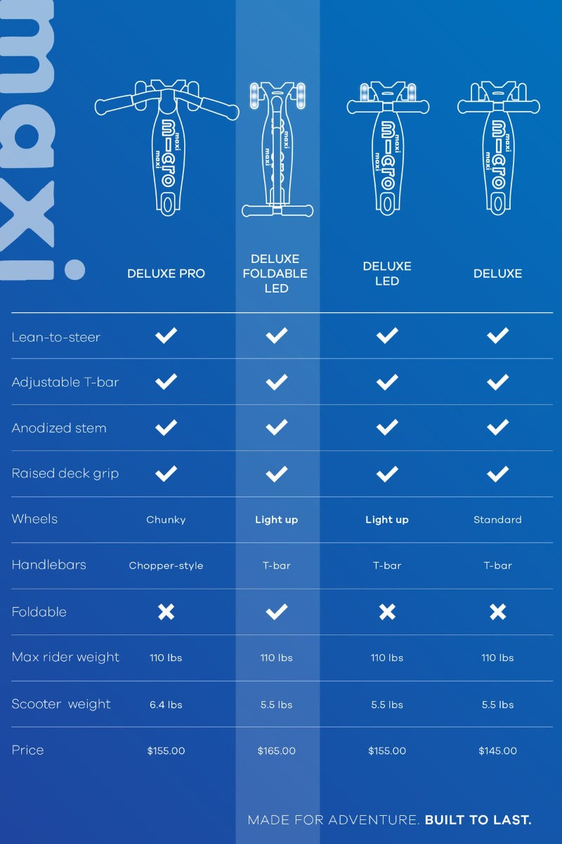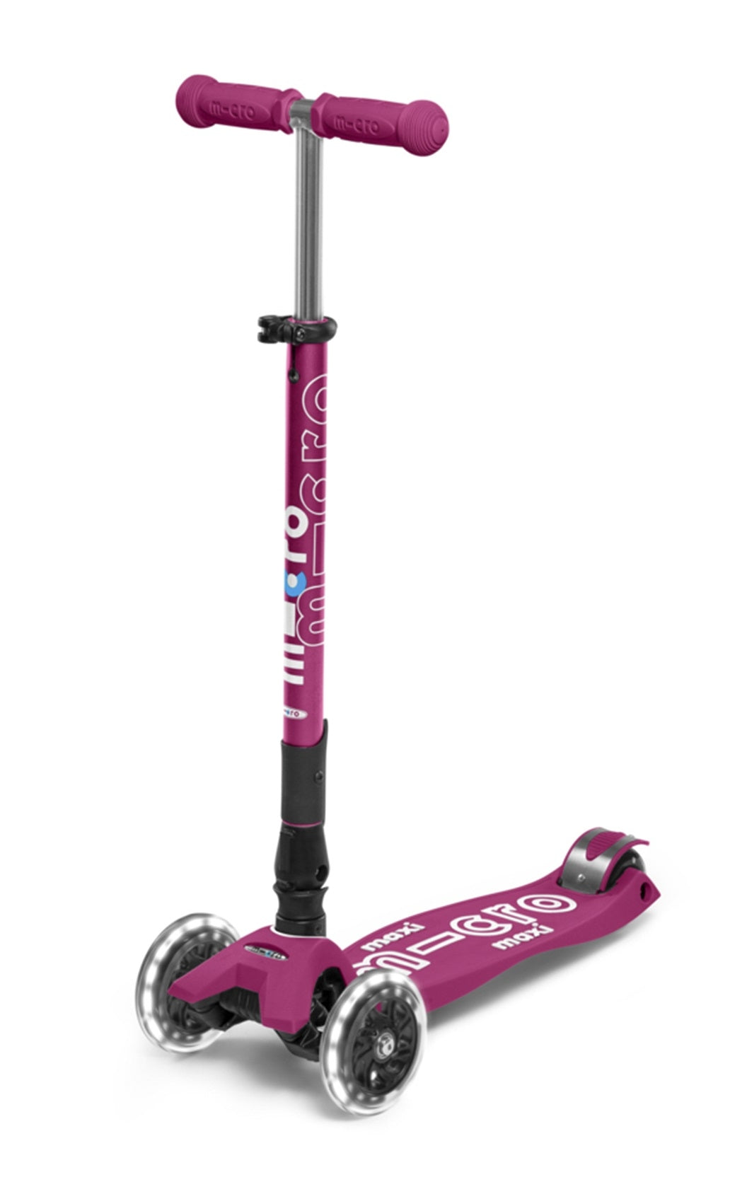 Micro Maxi Deluxe Foldable LED Scooter is a deluxe version scooter for ages 5-12 with an anodized stem for extra protection against wear and tear, a unique, silicone-injected footplate for improved grip, and an adjustable, easy-folding T-bar, making your travels even more convenient. The Maxi foldable can be stowed anywhere, whether in the car trunk, under the seat in school or in a locker. Featuring LED wheels that are motion-powered and light up as the wheels spin. They do not require batteries. Not only do they look good, the LED light wheels help your kids be more visible in the dark, keeping them safe as they enjoy the scooter.