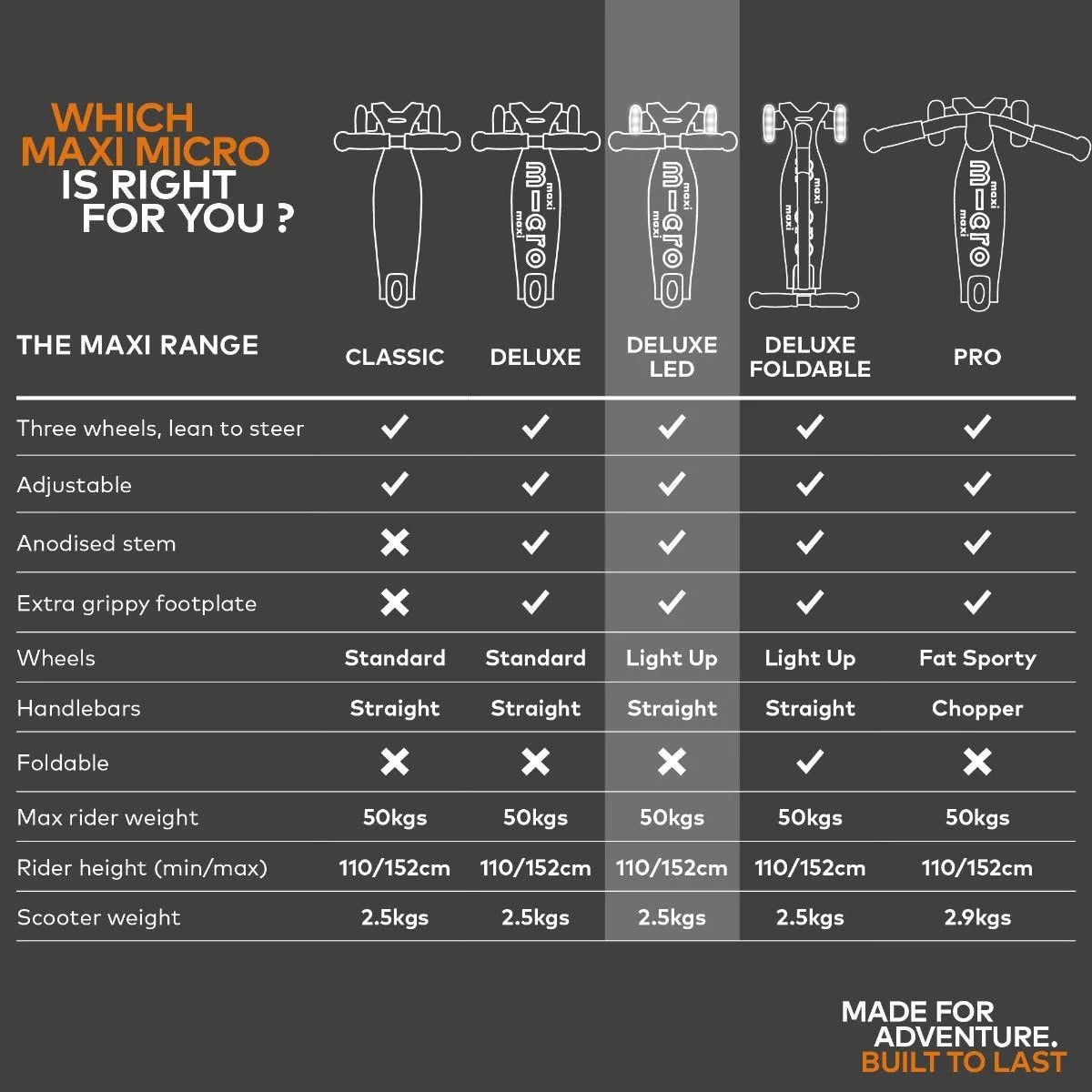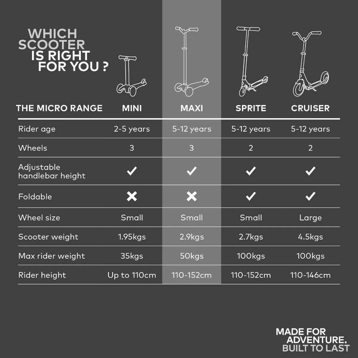 The Maxi Micro Deluxe is suitable for children aged 5 to 12. The maximum weight limit is 50g. The scooter specifically meets the needs of children aged 5-12 because it is lightweight weighing only 2.5kg. This makes it much easier to manage than any other scooter in our range.