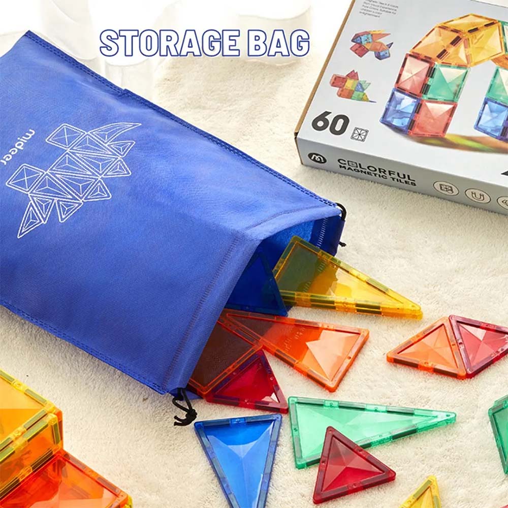 Mideer Colorful Magnetic Tiles go from flat to three-dimensional shapes. Discover the world of engineering with colourful magnetic blocks. Go from simple understanding to complex construction and gradually develop your child's brain. The unique slanted design allows light to easily pass through the magnetic blocks to create a glowing effect. The premium magnetic base ensures a stable construction process.